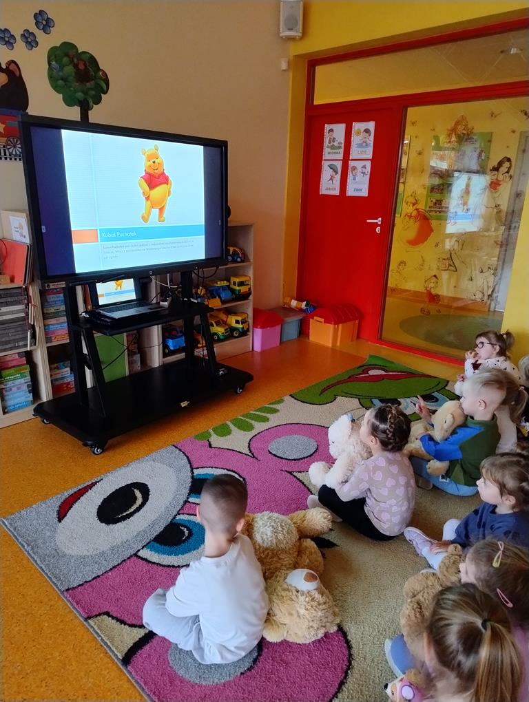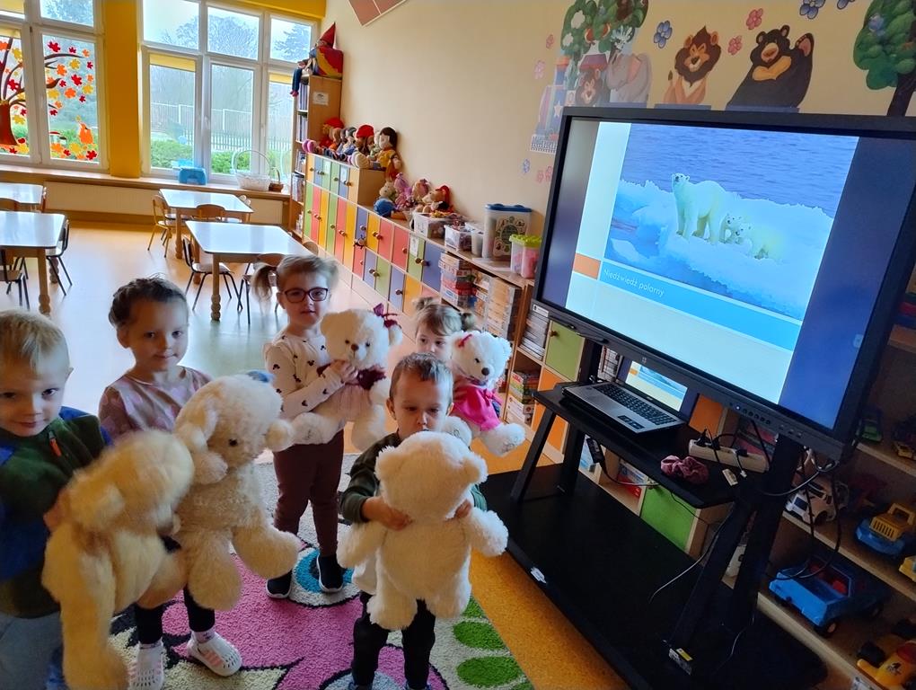 Dzieci poznały historię pluszowego misia oraz, dzięki prezentacji multimedialnej, dowiedziały się, jakie misie występują w bajkach, a także jakie gatunki niedźwiedzi żyją w przyrodzie. Zdobyta wiedza wzbudziła duże zainteresowanie i zachęciła do rozmów oraz zadawania pytań.