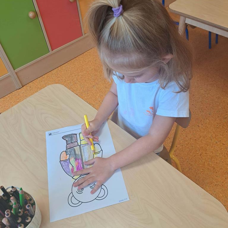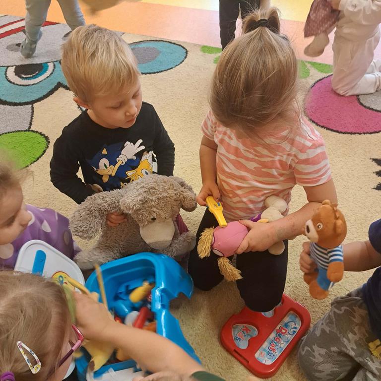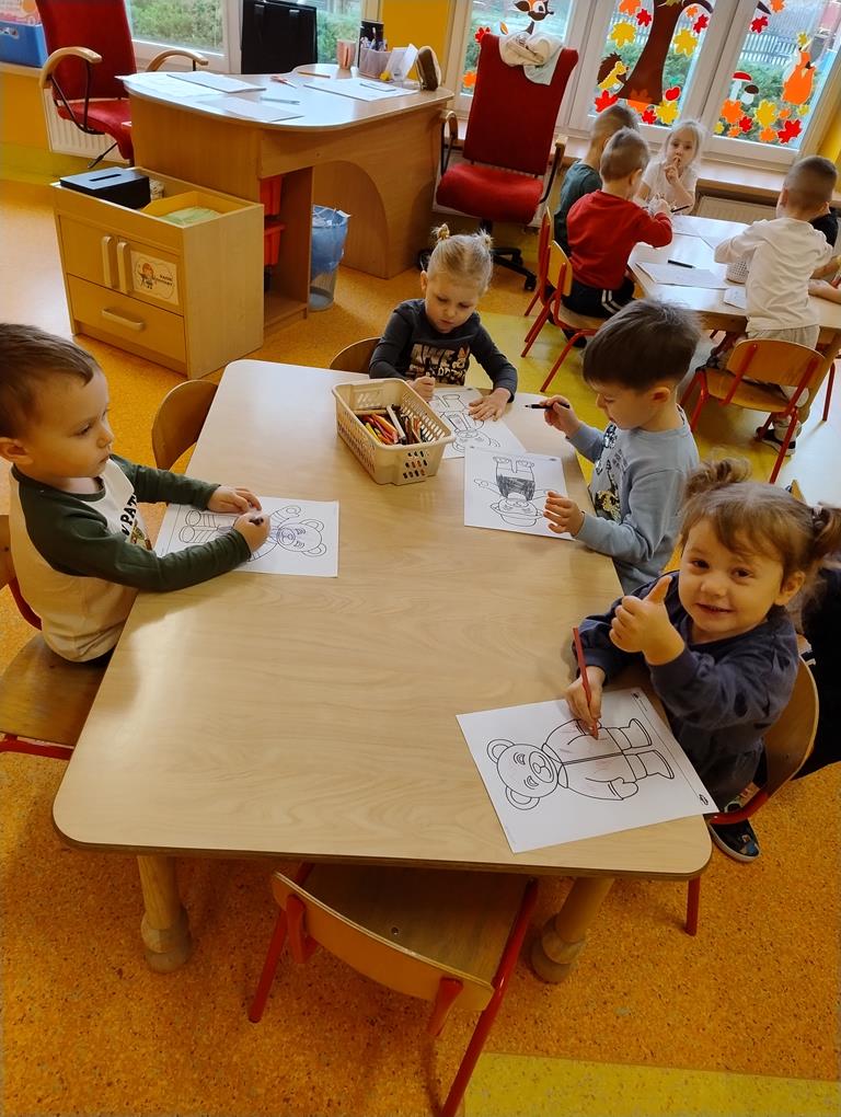 Nie zabrakło również wesołej zabawy. Dzieci brały udział w zabawach swobodnych, wcielając się m.in. w rolę weterynarza opiekującego się chorym misiem. Towarzyszyły im zabawy ruchowe i animacyjne w rytm muzyki, które dostarczyły wielu uśmiechów i pozytywnej energii. Przedszkolaki chętnie także kolorowały obrazki z misiami.