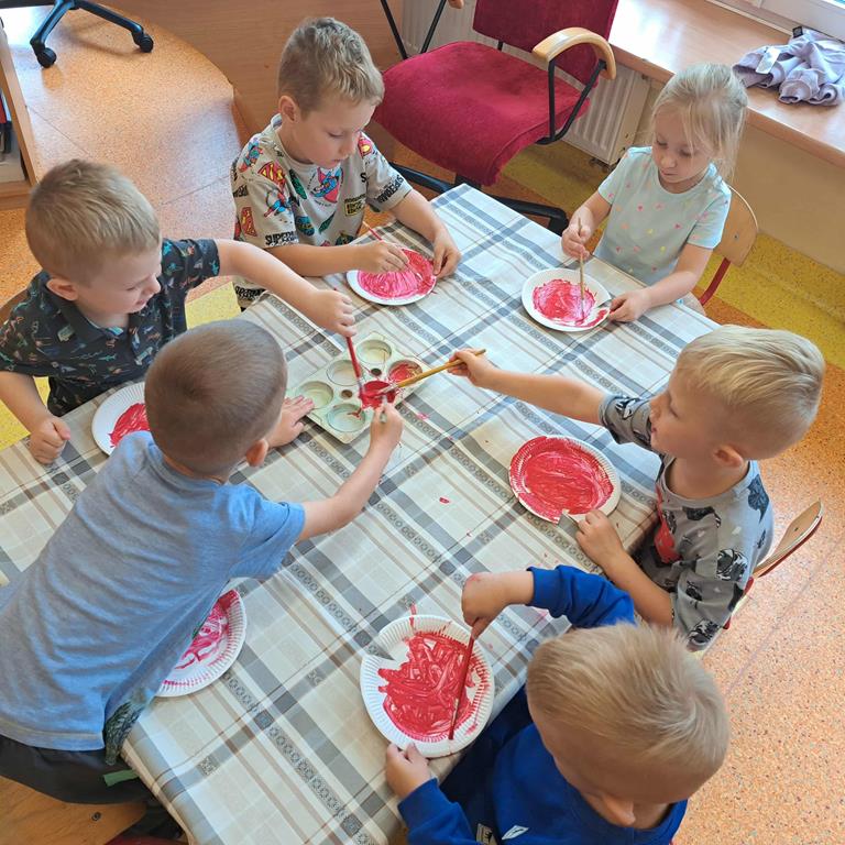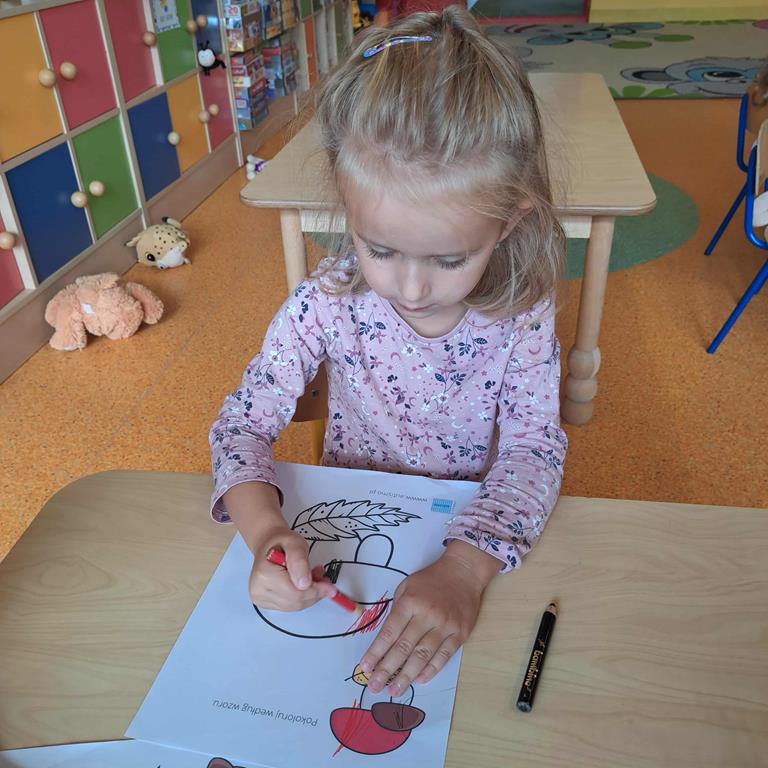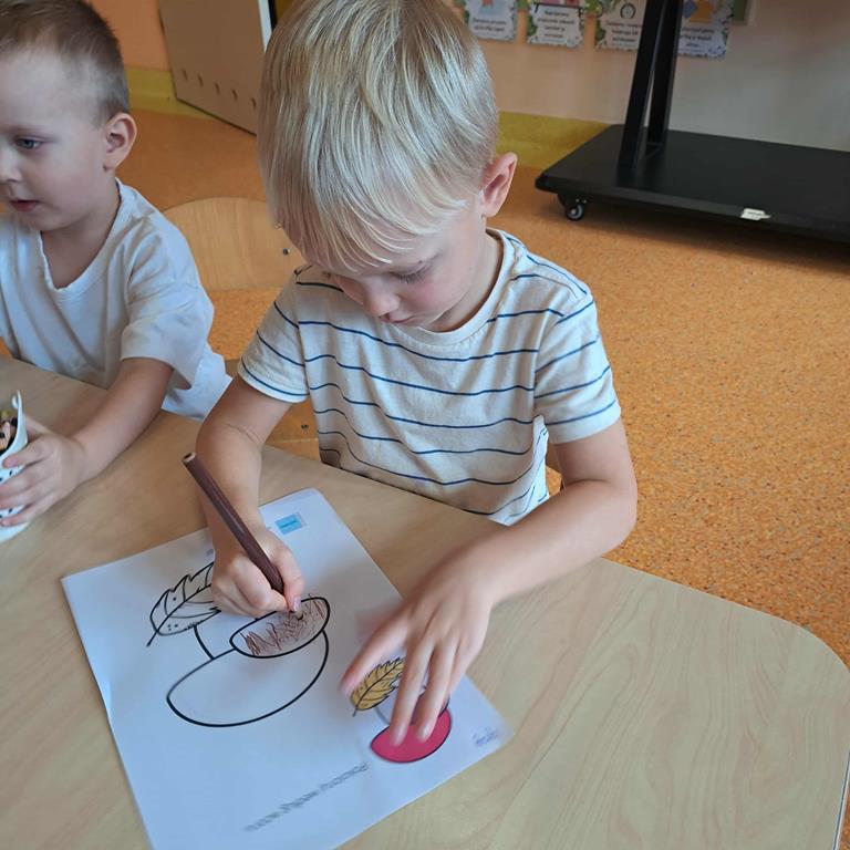 Przedszkolaki usprawniały małą motorykę, kolorując jesienną ilustrację według zaproponowanego kodu. Przedszkolaki wykonały również pracę plastyczną - jesienne jabłko z wykorzystaniem talerzyka papierowego.
