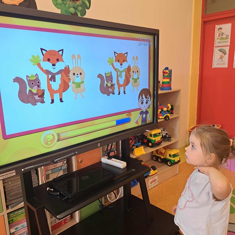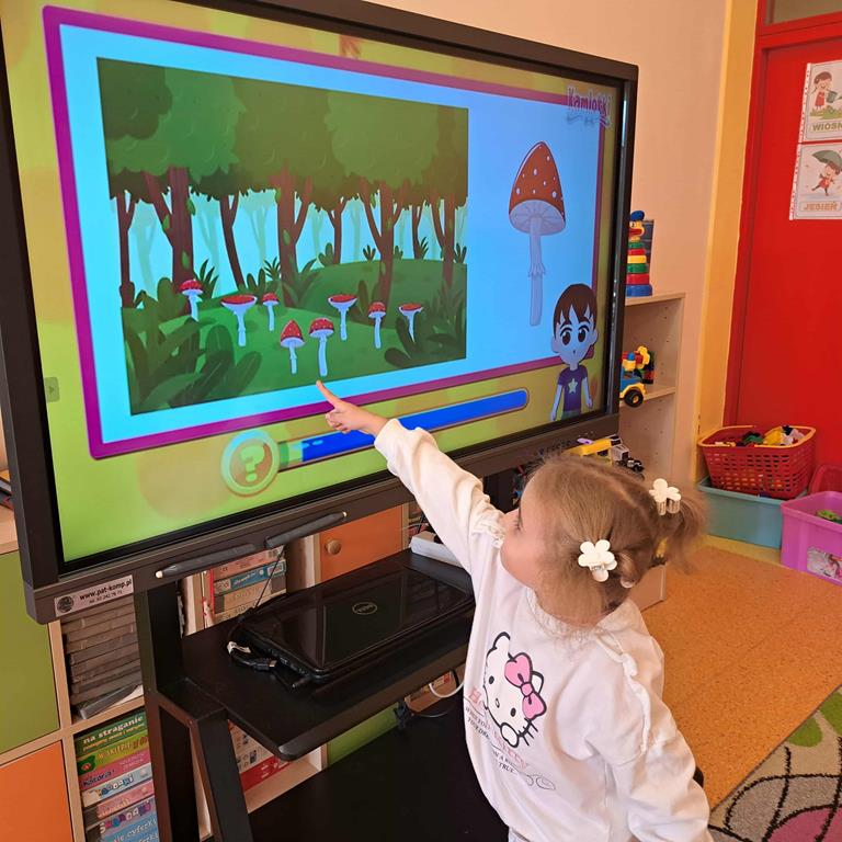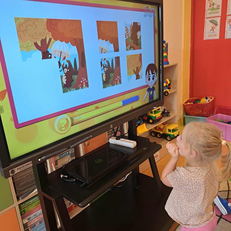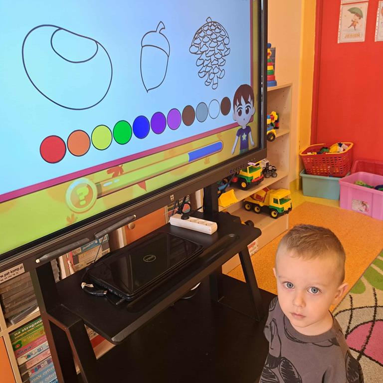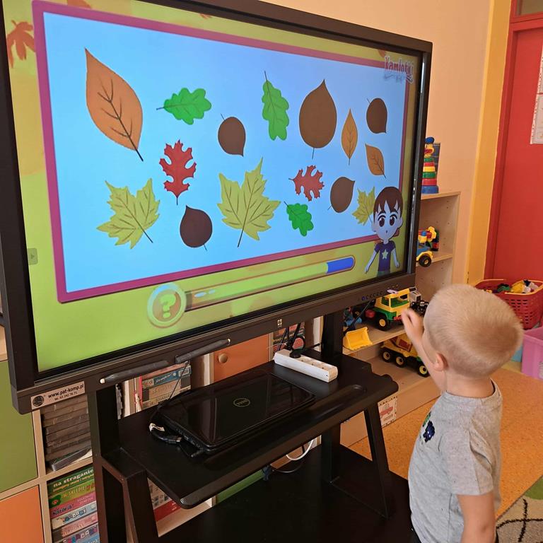 Dzieci rozwiązywały zagadki z wykorzystaniem ekranu multimedialnego, poszerzając wiedzę na temat pory roku - jesieni.