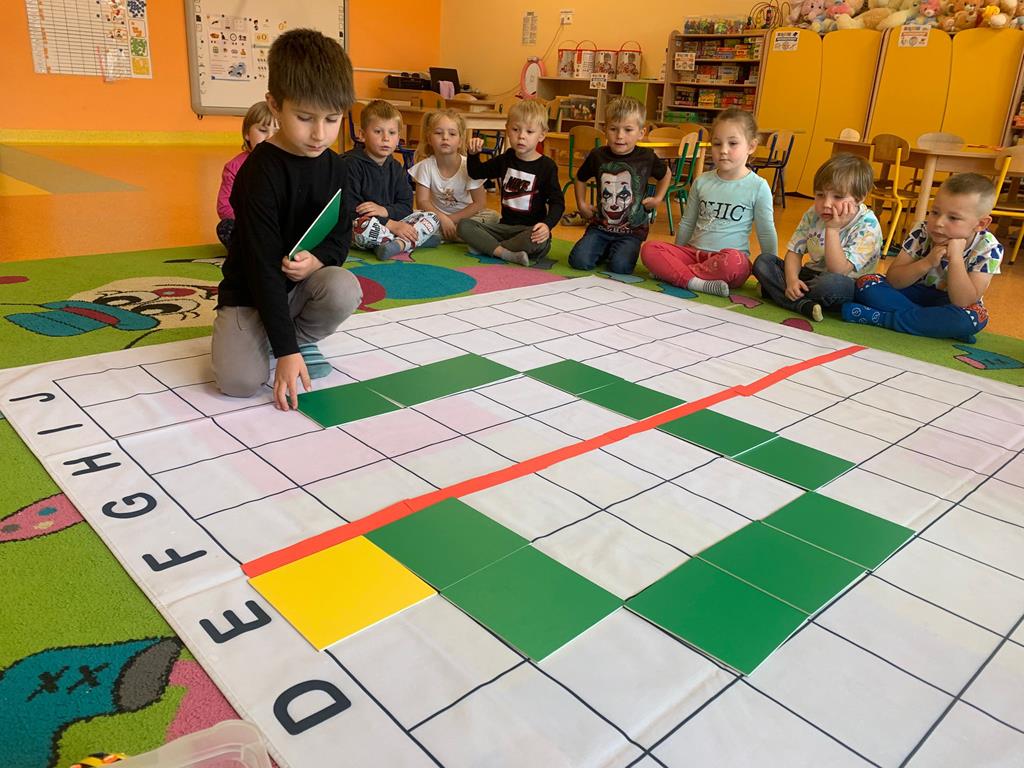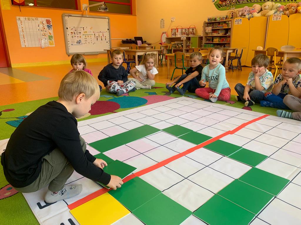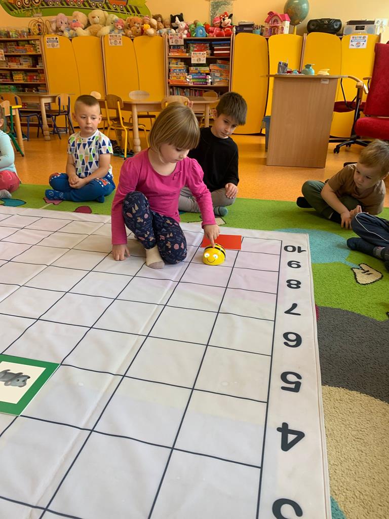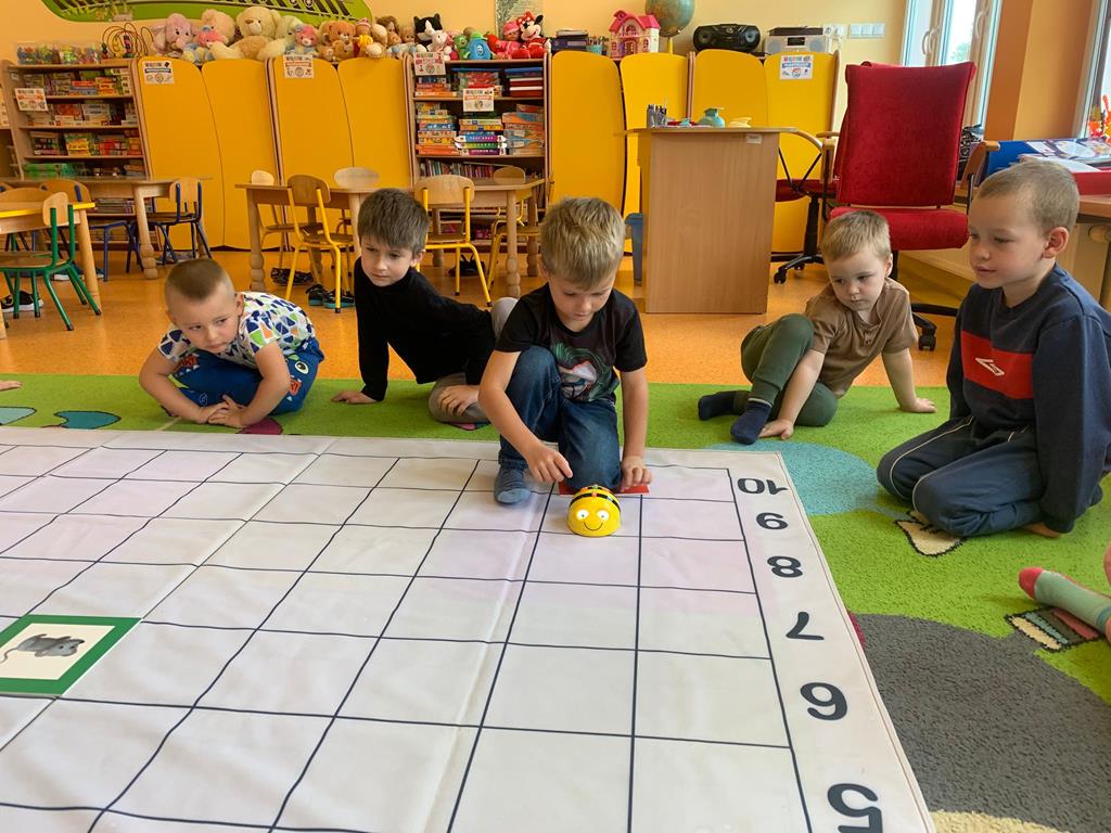 Kodowanie na dywanie to zabawy i gry bez użycia komputerów. Dnia 8 października 2025 roku dzieci z grupy Motylki uczyły się programować robota "Bibot". Dzieci rozkodowywały piktogramy by dojść do celu, omijały przeszkody. Doskonaliły także logiczne myślenie, koncentrację uwagi podczas zabawy "Symetryczne obrazki."
