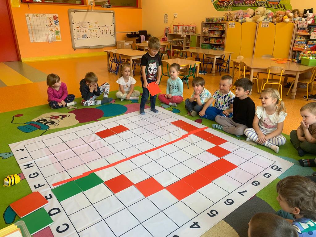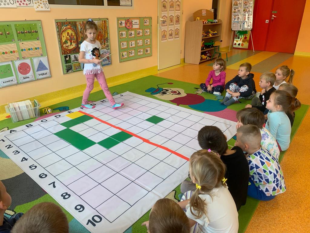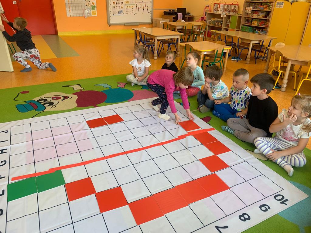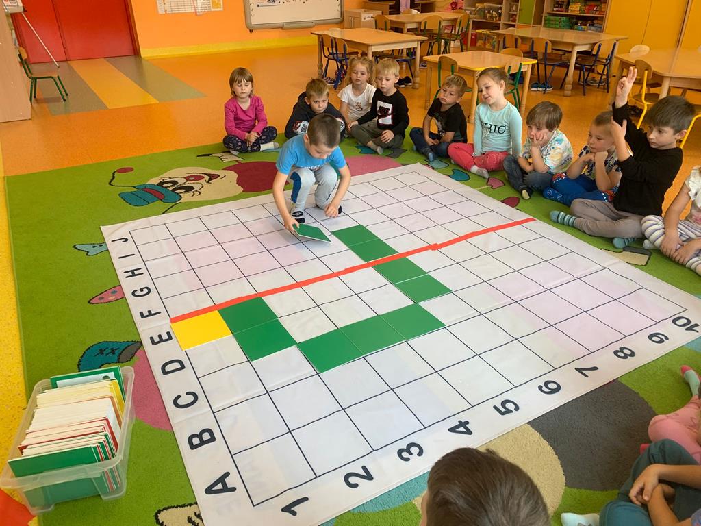 Kodowanie na dywanie to zabawy i gry bez użycia komputerów. Dnia 8 października 2025 roku dzieci z grupy Motylki uczyły się programować robota "Bibot". Dzieci rozkodowywały piktogramy by dojść do celu, omijały przeszkody. Doskonaliły także logiczne myślenie, koncentrację uwagi podczas zabawy "Symetryczne obrazki."