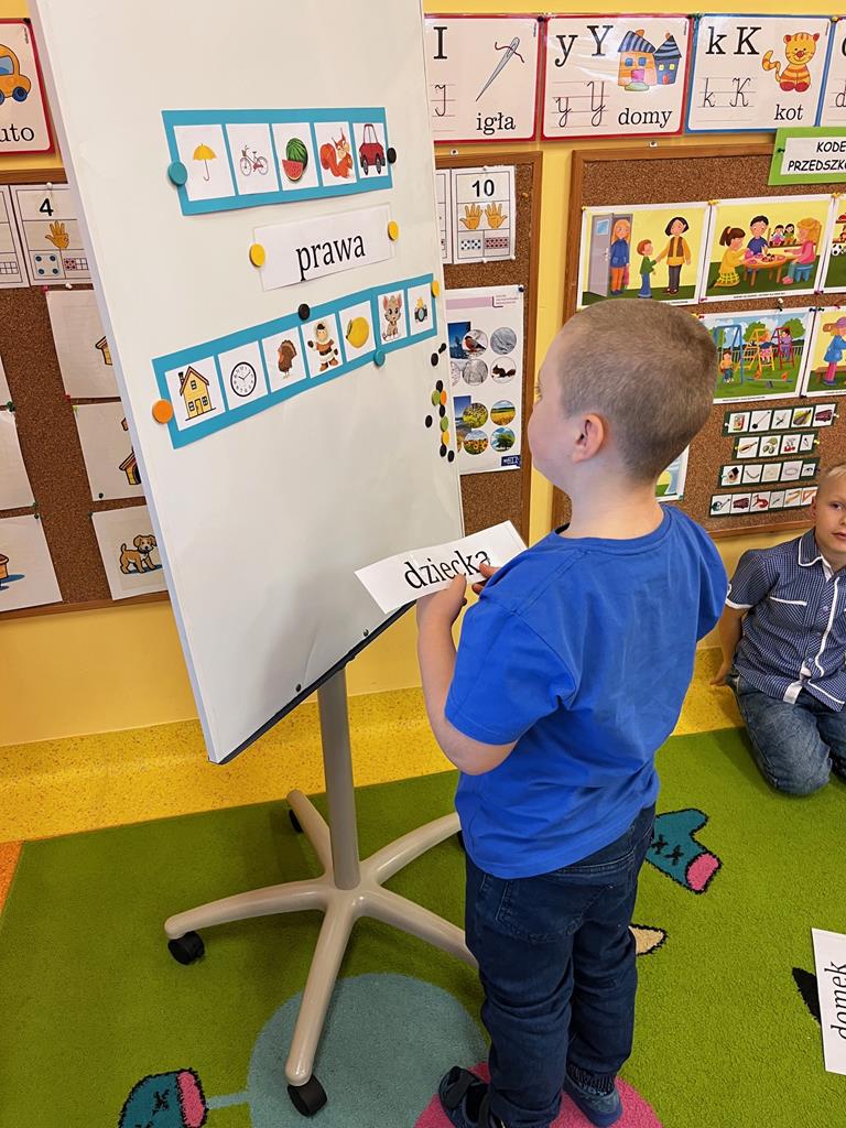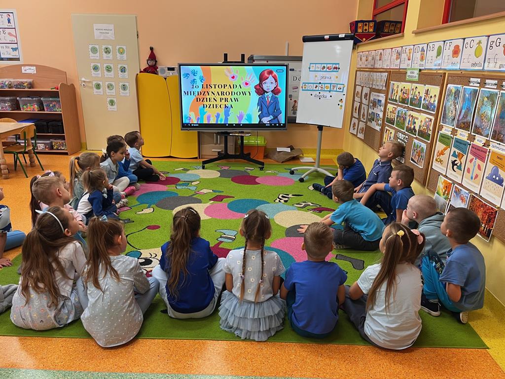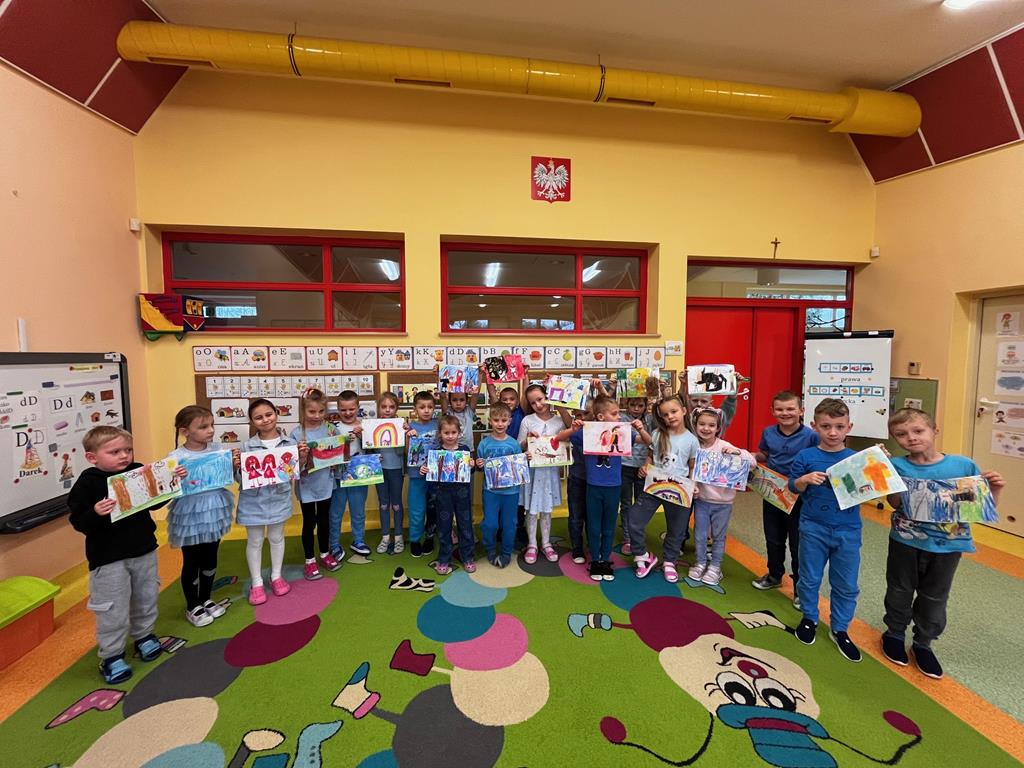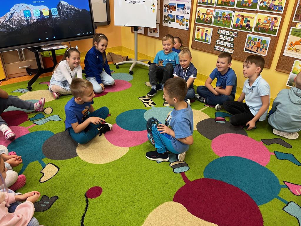 Dnia 20.11. 2025r. grupa „Pszczółek” obchodziła Międzynarodowy Dzień Praw Dziecka. Tego dnia przedszkolaki przyszły ubrane w kolorze niebieskim, aby pokazać solidarność ze wszystkimi dziećmi na świecie, również tymi, których prawa nie są przestrzegane. Dzieci rozwiązywały rebus fonetyczny, którego rozwiązaniem było hasło: prawa dziecka. Oglądały film edukacyjny, pt.: „Prawa i obowiązki dzieci”, który był pretekstem do rozmowy na temat Konwencji o Prawach Dziecka. Następnie dzieci dopasowywały wylosowane przedmioty charakterystyczne dla poszczególnych praw. Ilustrowały ruchem treści wiersza "Mały człowiek, duża sprawa". Odgrywały także mini- scenki „Co zrobić, gdy prawa są łamane?” Na koniec w zabawie z chustą animacyjną utrwalały nazwy praw dziecka w zabawie „Parasol praw dziecka.” Na koniec dzieci rozwijały swoją twórczość plastyczną i przygotowały ilustracje na temat „Moje ulubione prawo.”