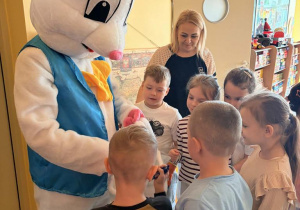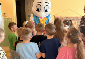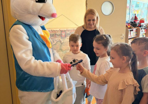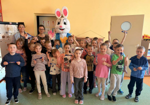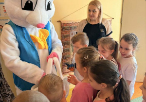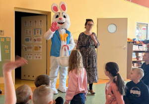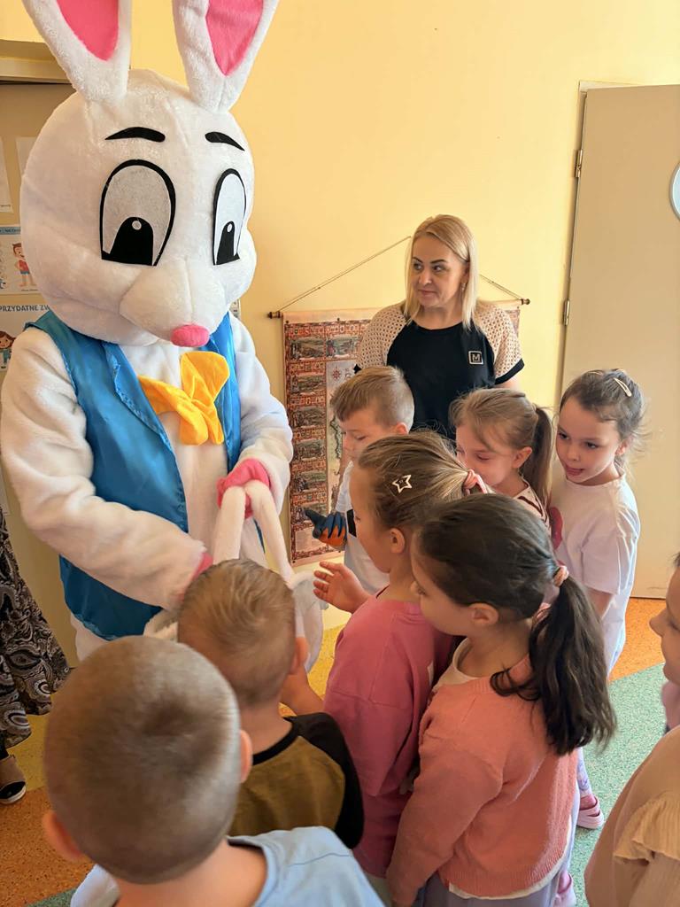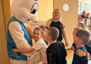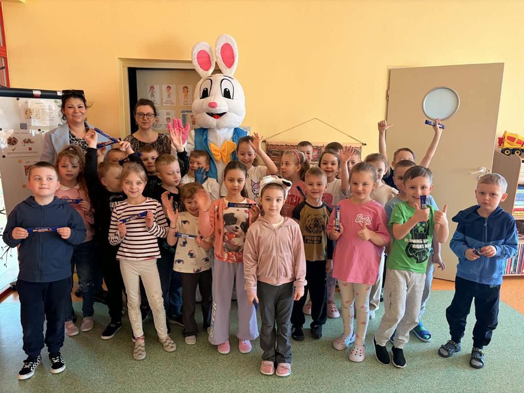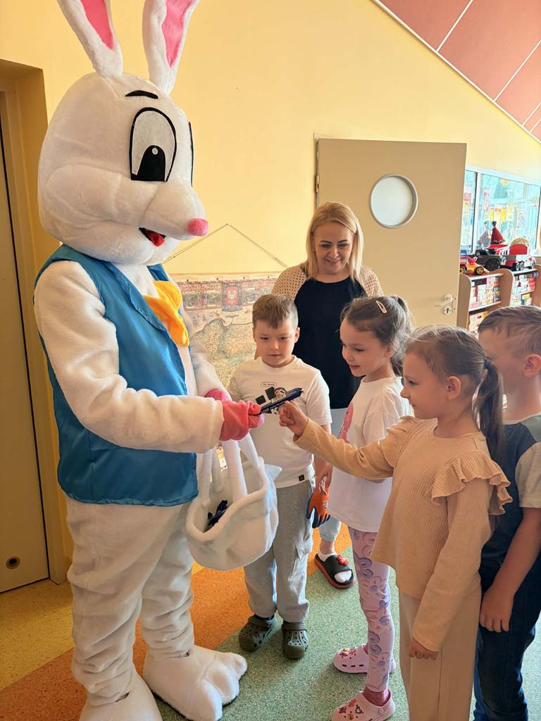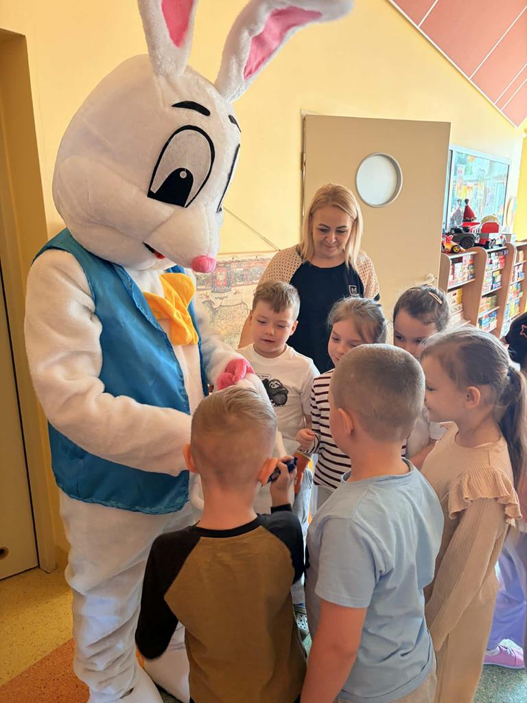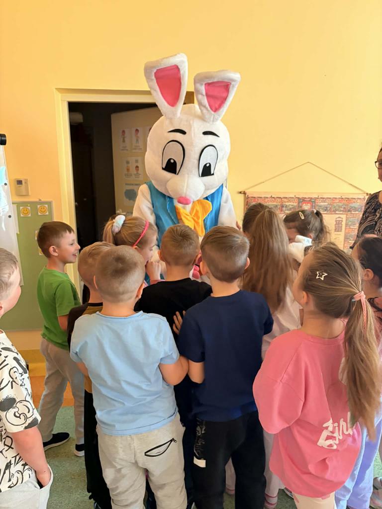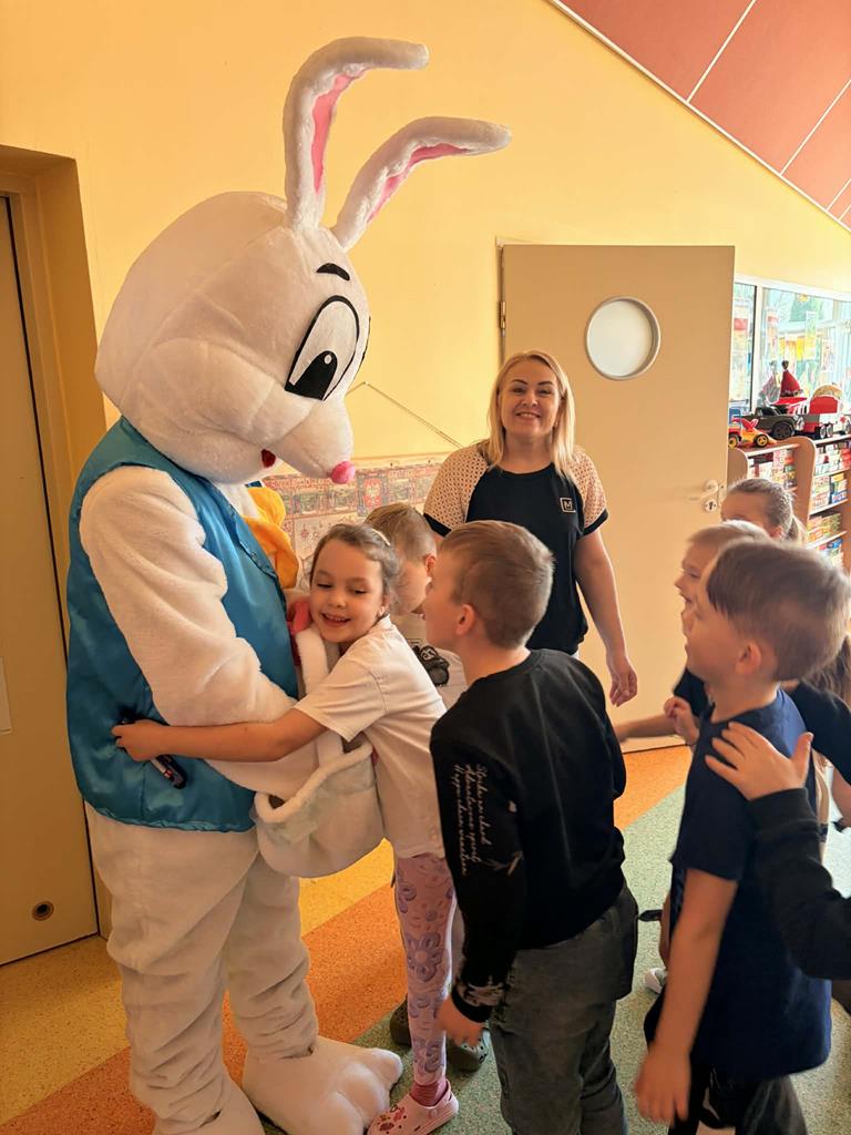 Tuż przed nadchodzącymi Świętami Wielkanocnymi nasze przedszkole odwiedził bardzo puszysty gość – sam Wielkanocny Zajączek! Dzieci byłe bardzo szczęśliwe, gdy radosny zajączek zawitał do sali z koszykiem pełnym niespodzianek. Zajączek obdarował każdego przedszkolaka pysznym, słodkim wafelkiem.