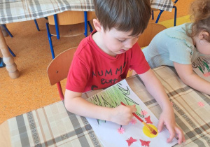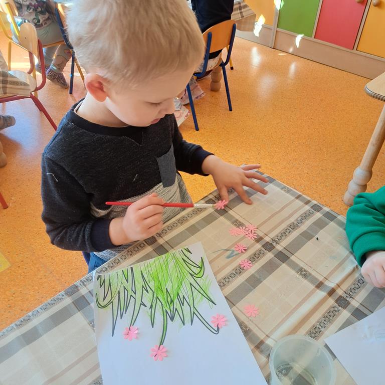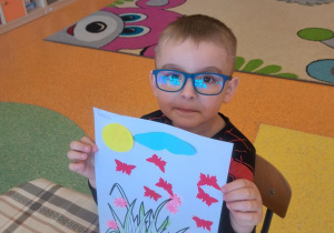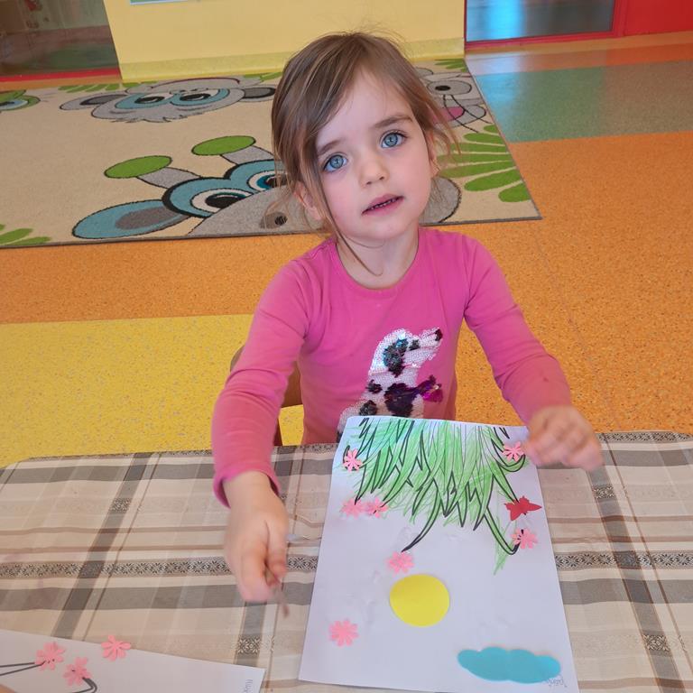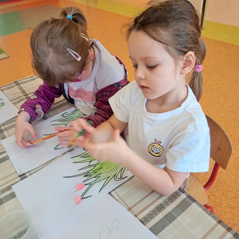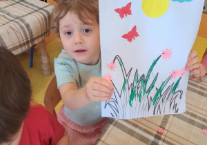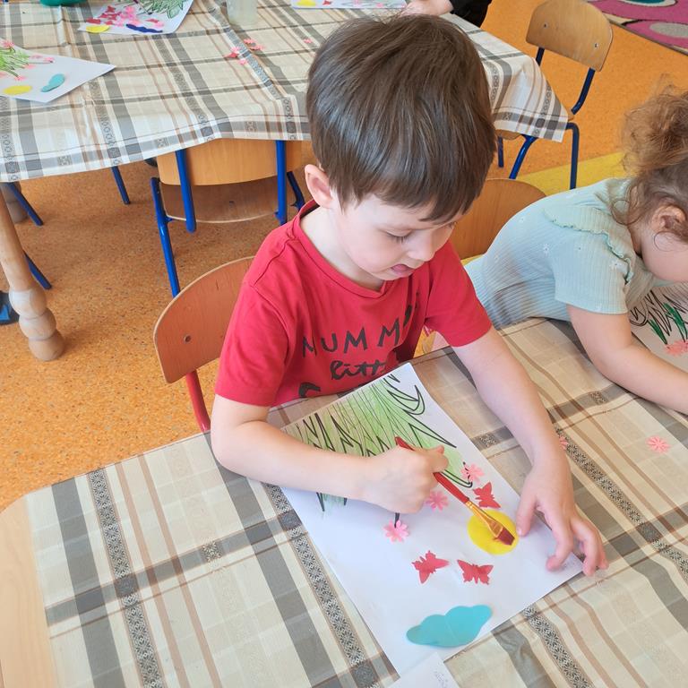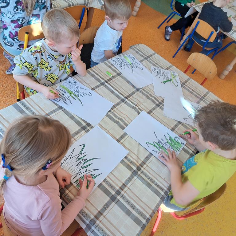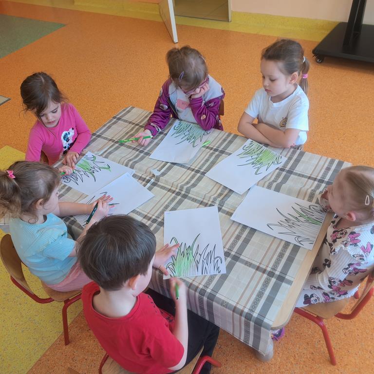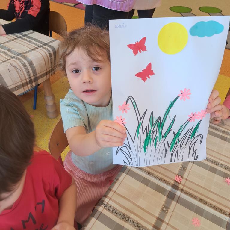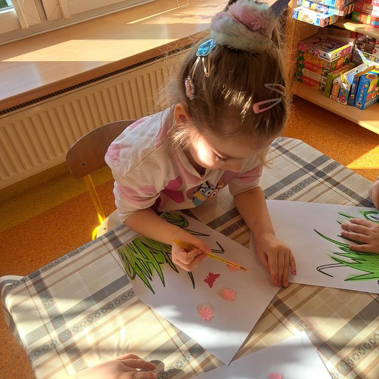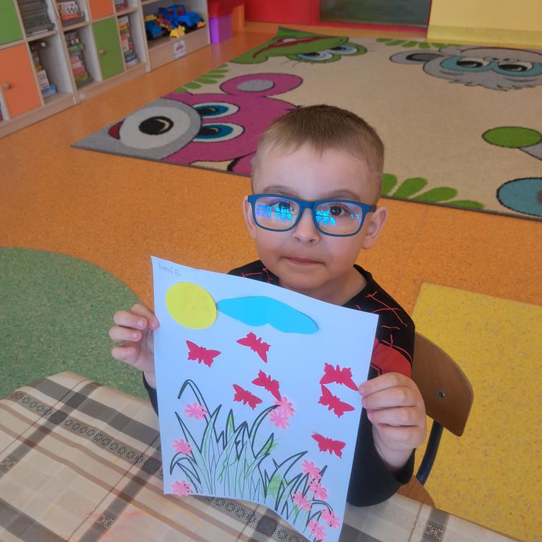 W dniu 18 marca 2026 roku dzieci z grupy "Biedronki" wykonały pracę plastyczną na temat "Wiosenna łąka" techniką mieszaną. Przedszkolaki usprawniały pracę rąk, poprzez kolorowanie trawy, przyklejanie wyciętych z papieru elementów : chmur, kwiatów, motyli, słońca. Tego dnia dzieci rozmawiały o oznakach wiosny, podawały przykłady zmian zachodzących w przyrodzie wczesną wiosną.