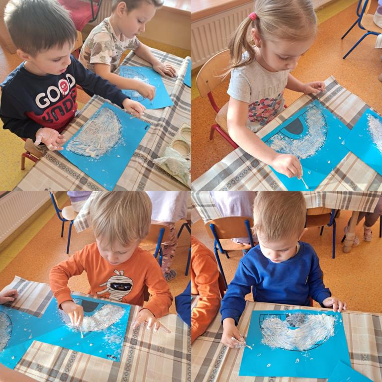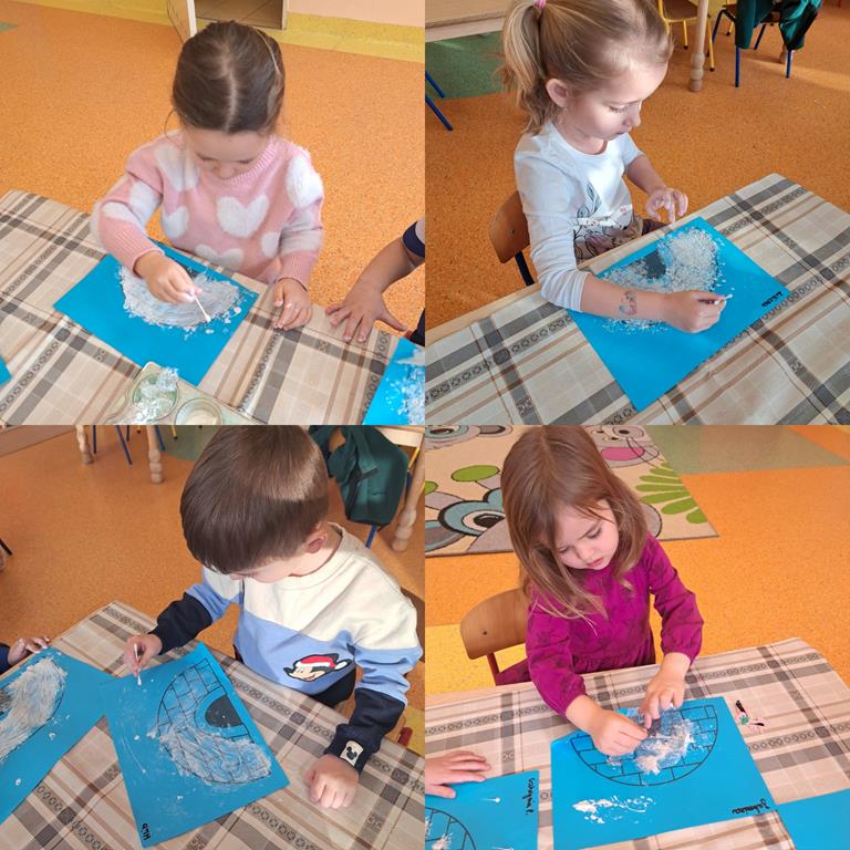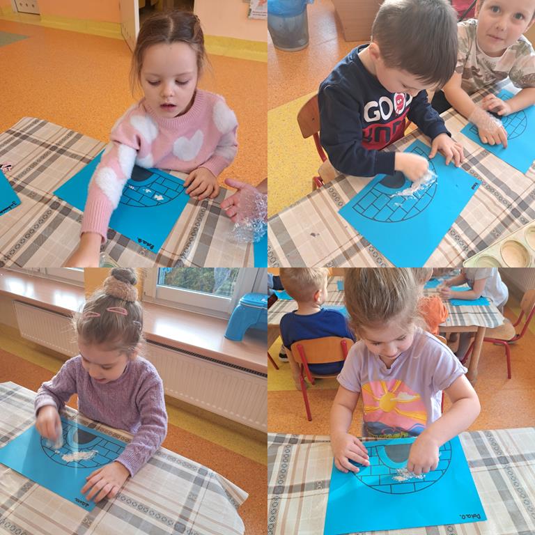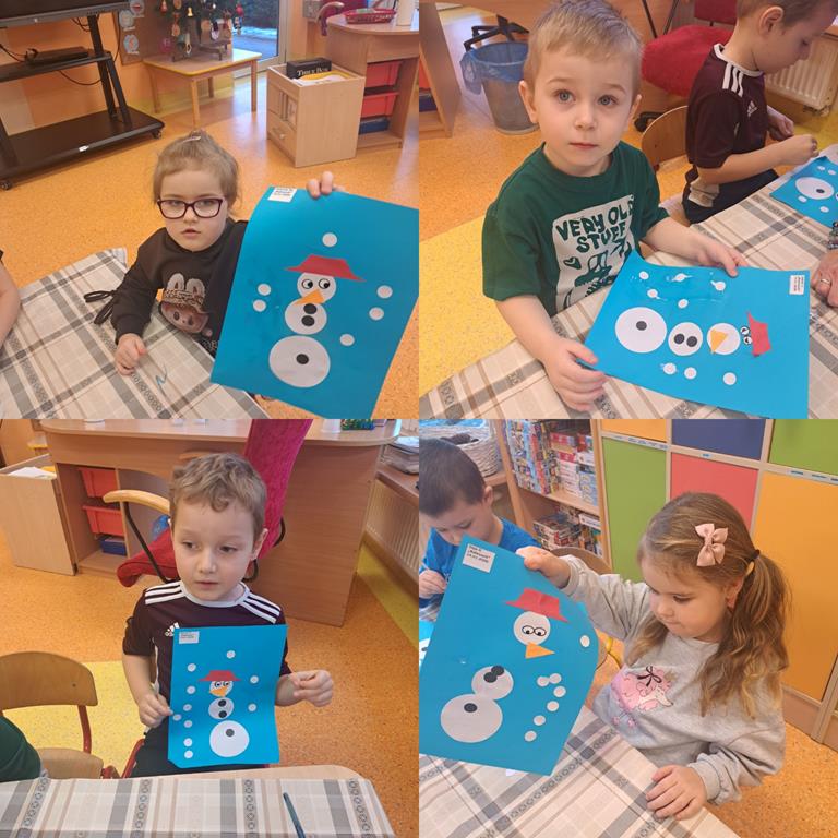 W dniach 12 - 16.01. 2026 r. dzieci z grupy "Biedronki" realizowały temat kompleksowy "Bezpieczne zabawy na śniegu i lodzie". Przedszkolaki zdobyły cenne wiadomości na temat bezpieczeństwa podczas zimowych zabaw, a także wykonały dwie prace plastyczne. Pierwsza z nich, to praca na temat "Bałwanek", podczas której dzieci przyklejały elementy wycięte z papieru - według instrukcji słownej i pokazowej pracy nauczyciela. Druga praca plastyczna, to praca na temat "Igloo", podczas której przedszkolaki stemplowały białą farbą przy pomocy folii bąbelkowej oraz patyczka higienicznego.