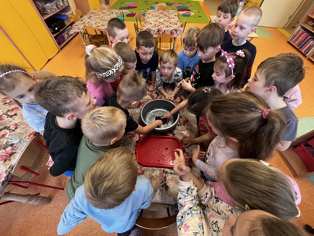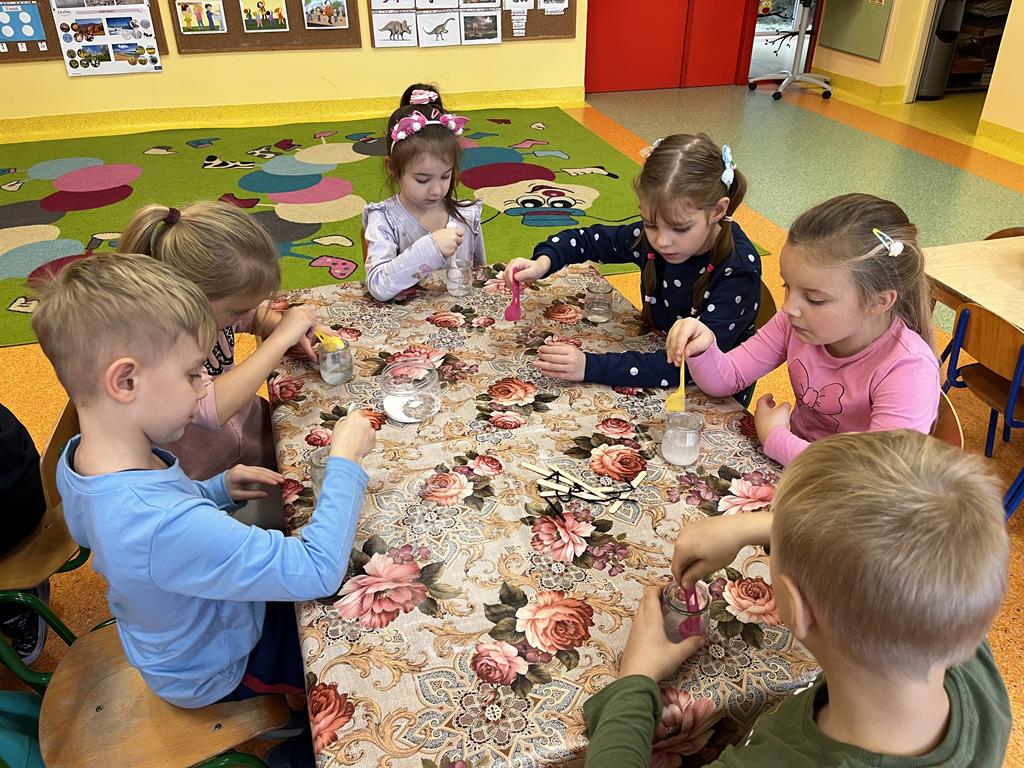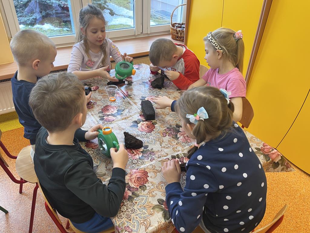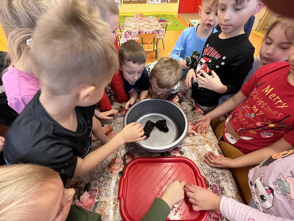 3 grudnia grupa Pszczółki zamieniła salę przedszkolną w prawdziwe laboratorium! Dzieci wzięły udział w fascynujących zabawach badawczych, podczas których poznały fizyczne właściwości dwóch popularnych minerałów: soli i węgla.