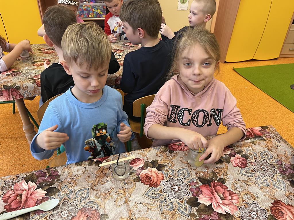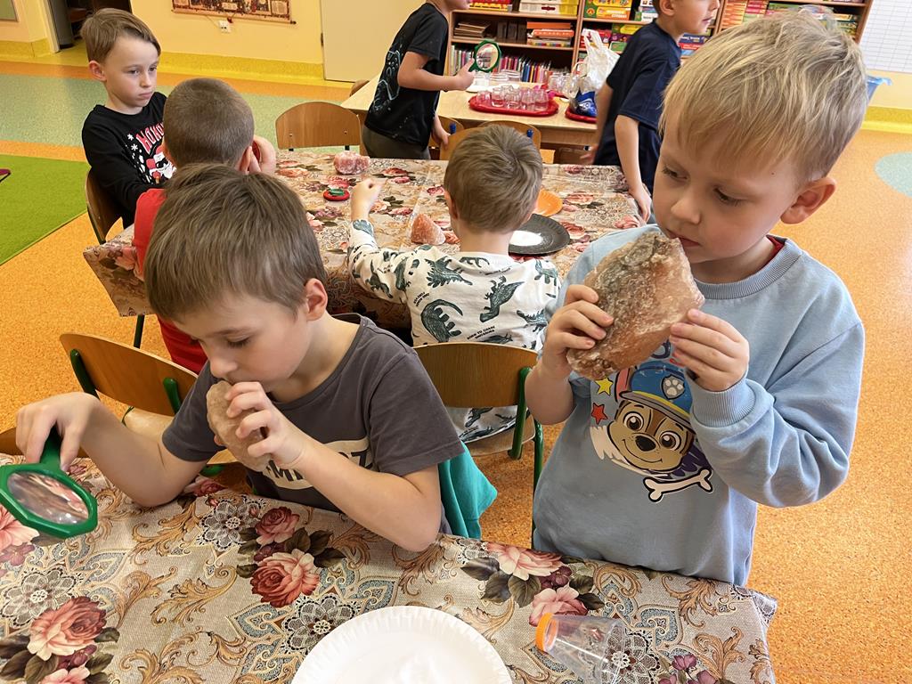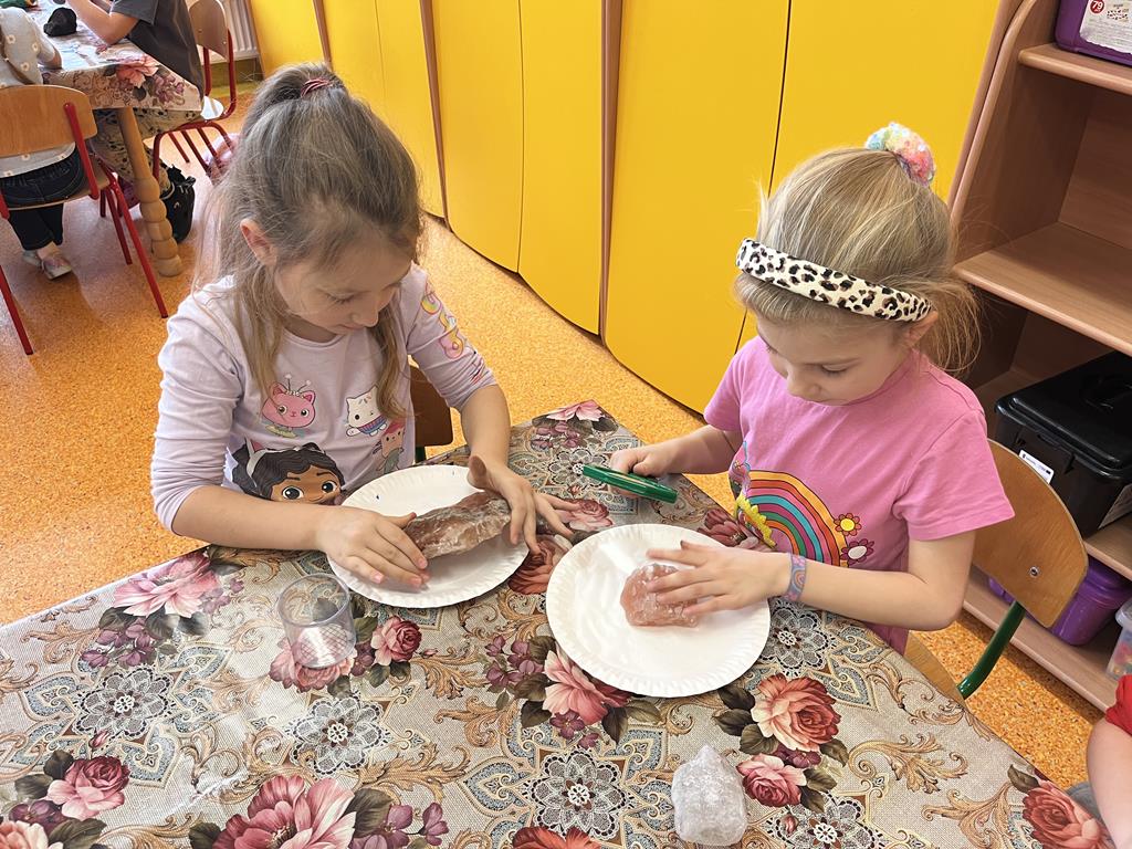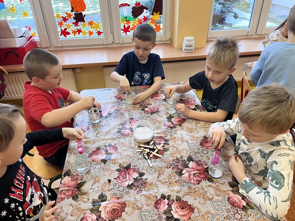 3 grudnia grupa Pszczółki zamieniła salę przedszkolną w prawdziwe laboratorium! Dzieci wzięły udział w fascynujących zabawach badawczych, podczas których poznały fizyczne właściwości dwóch popularnych minerałów: soli i węgla.