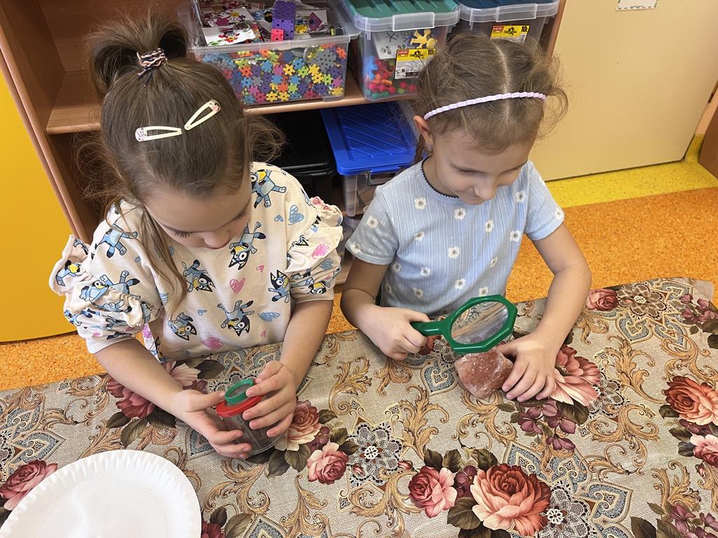 Przedszkolaki aktywnie poznawały świat wieloma zmysłami. Używając lup, bacznie obserwowały strukturę obu substancji, dotykały ich i wąchały, odkrywając różnice w fakturze i wyglądzie.