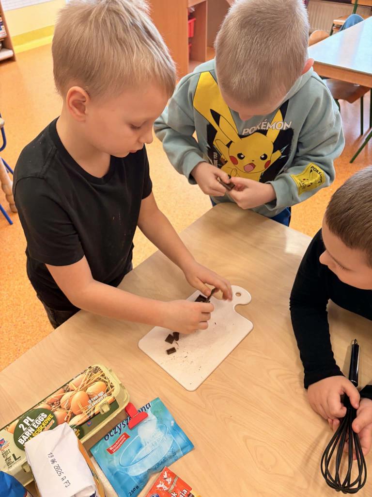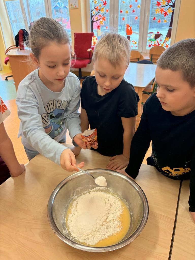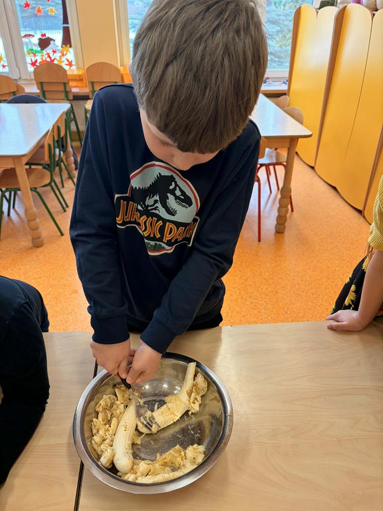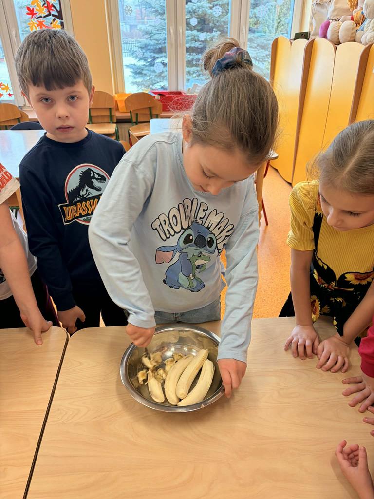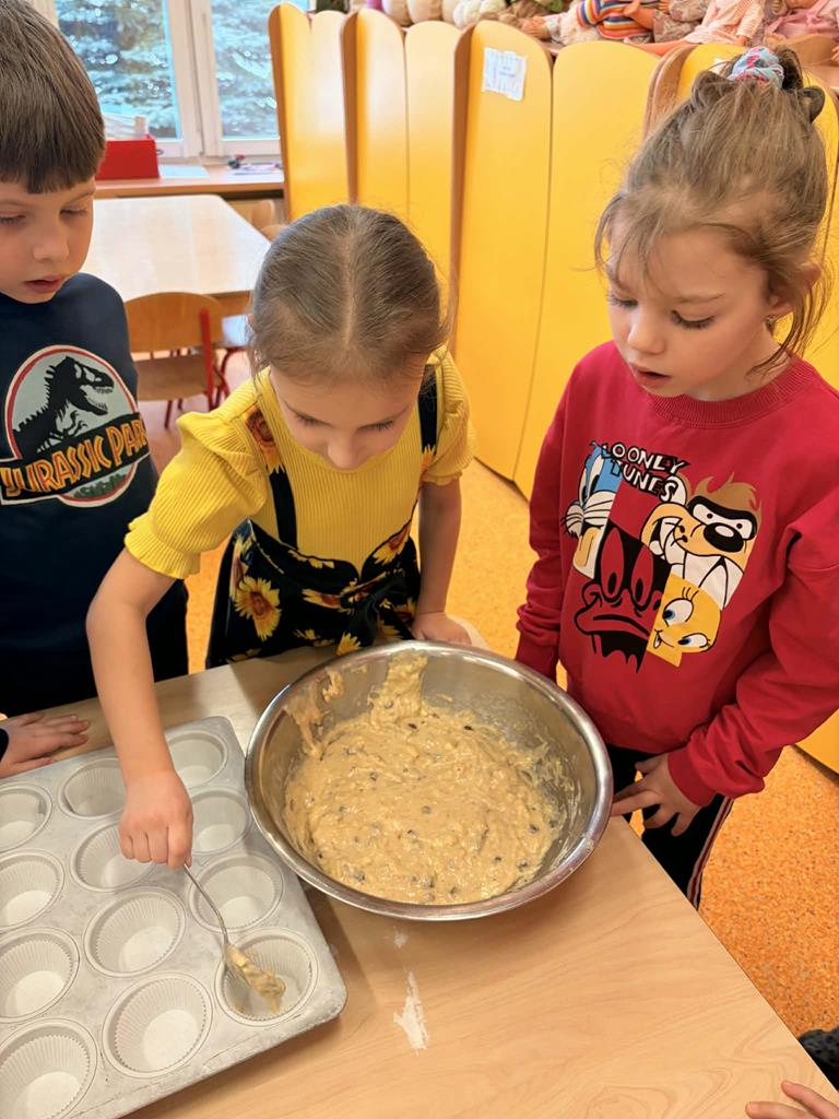 Dnia 6 lutego na zajęciach kulinarnych w grupie "Pszczółki" dzieci z wielkim zaangażowaniem przygotowały pyszne babeczki bananowe z kawałkami czekolady. Mali kucharze samodzielnie rozgniatali banany, odmierzali składniki i mieszali ciasto, doskonaląc przy tym swoją motorykę małą oraz ucząc się cierpliwości. Najwięcej radości sprawiło dzieciom dodawanie czekoladowych drobinek, które stały się „wisienką na torcie” naszych wypieków.