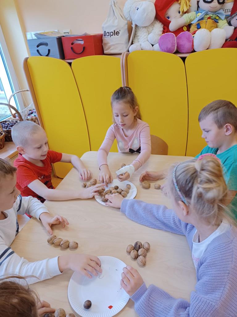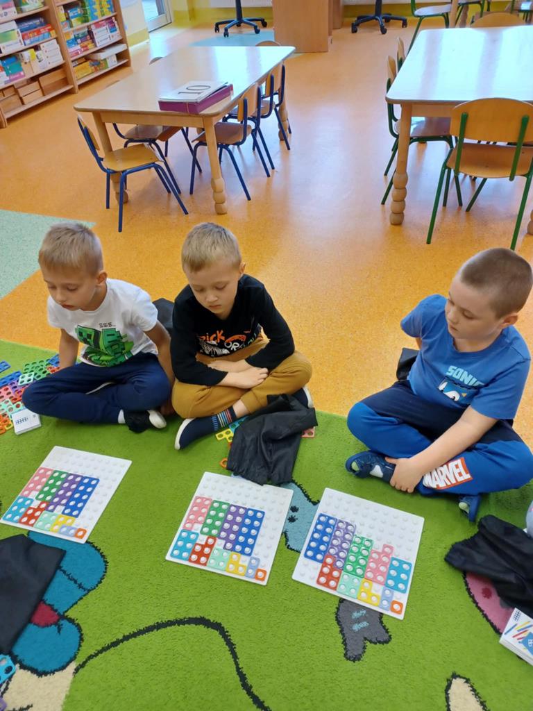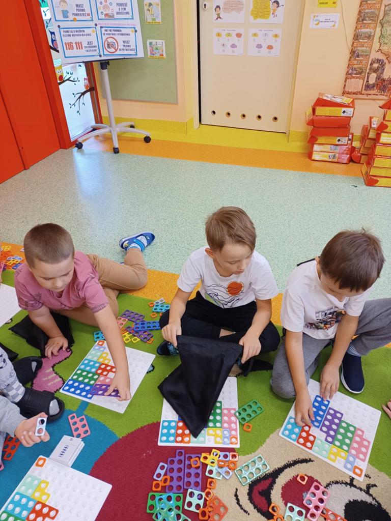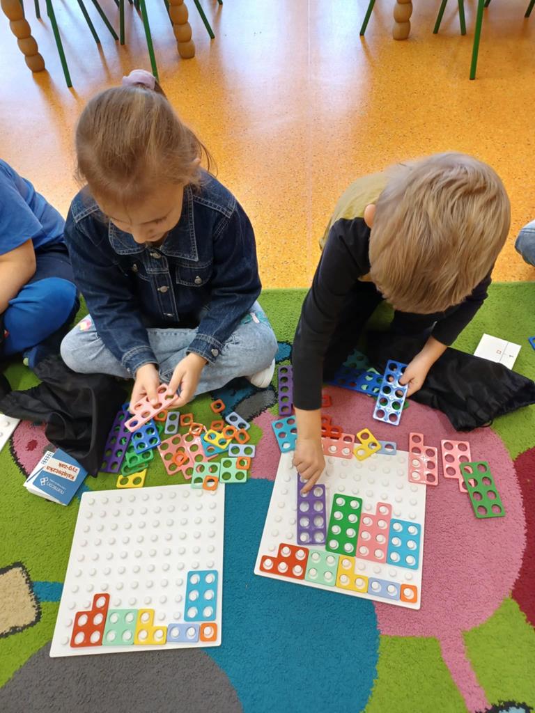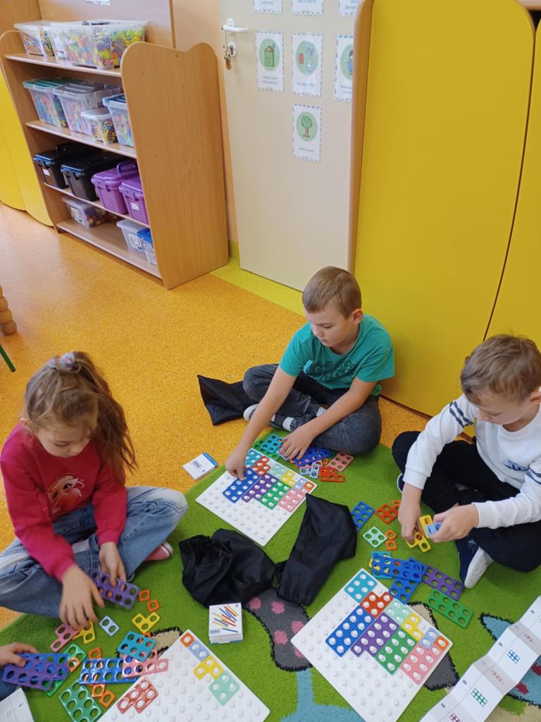 z wykorzystaniem zestawu klocków Numicon. Dzieci segregowały, przeliczały i porównywały elementy z wykorzystaniem materiału przyrodniczego oraz patyczków.