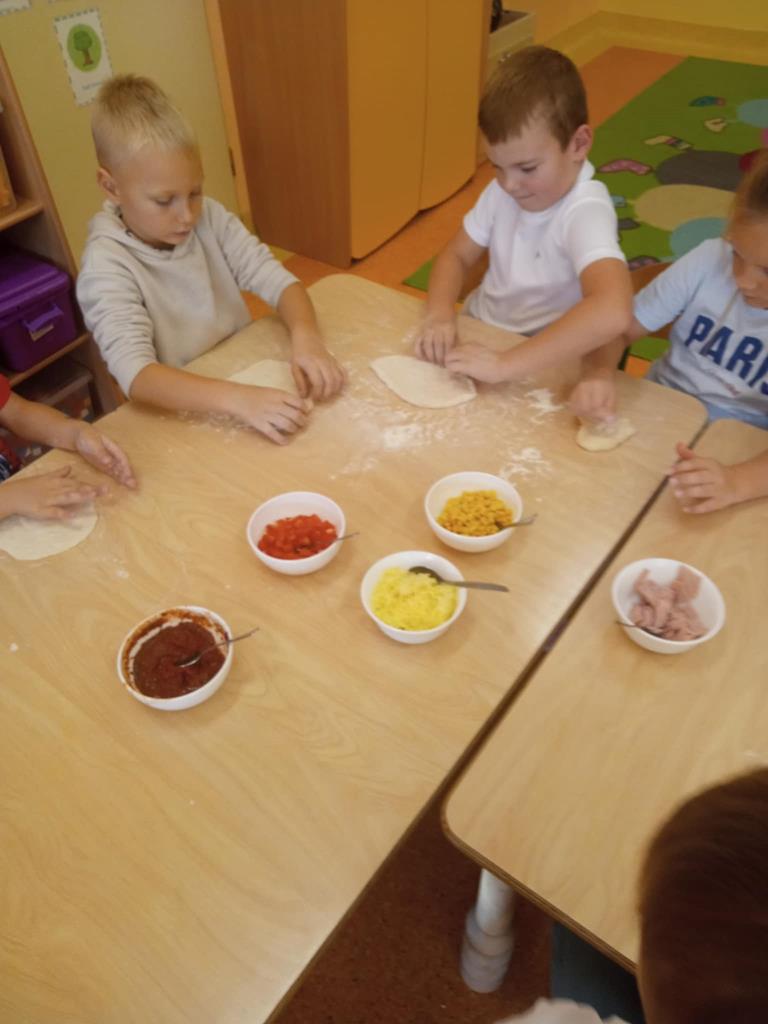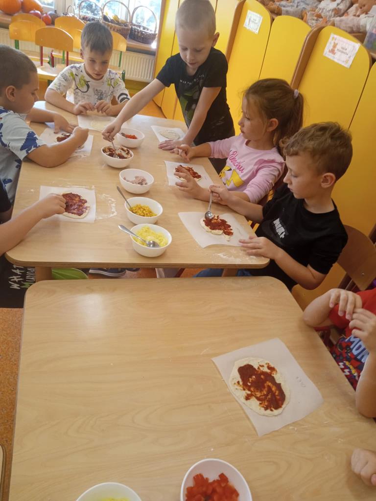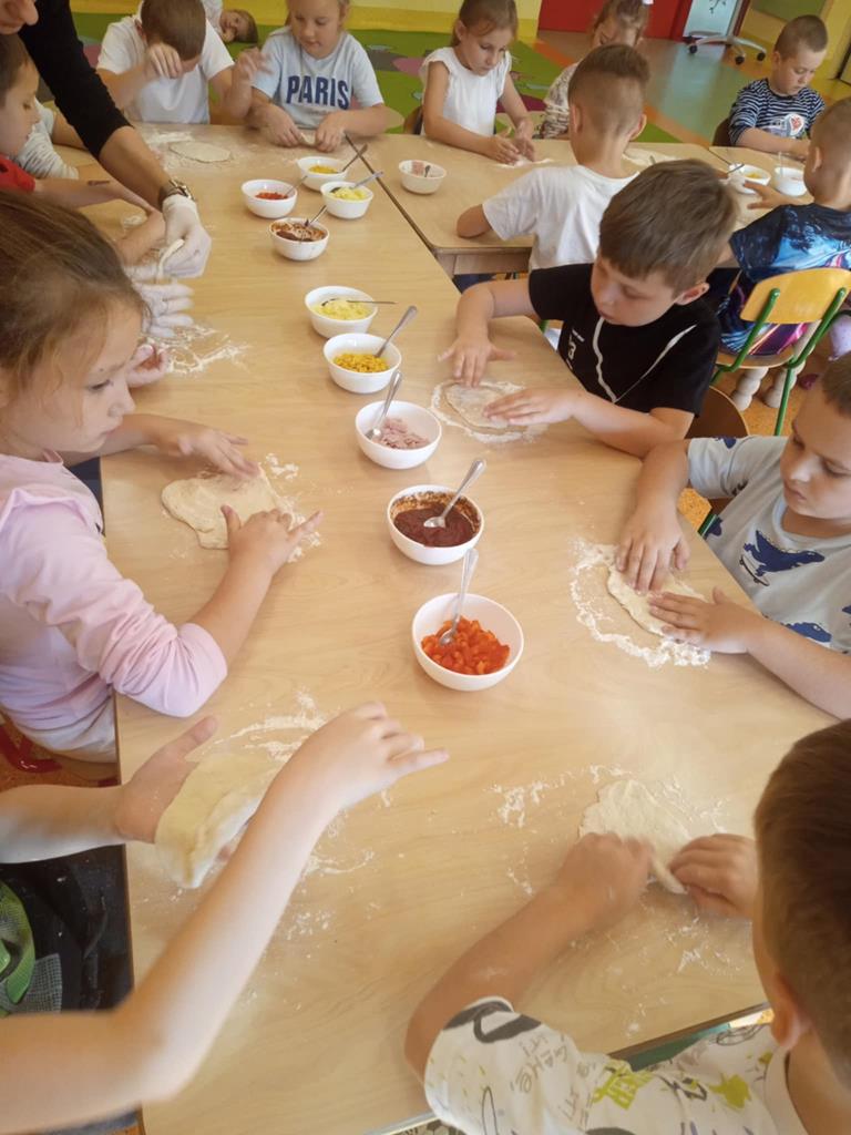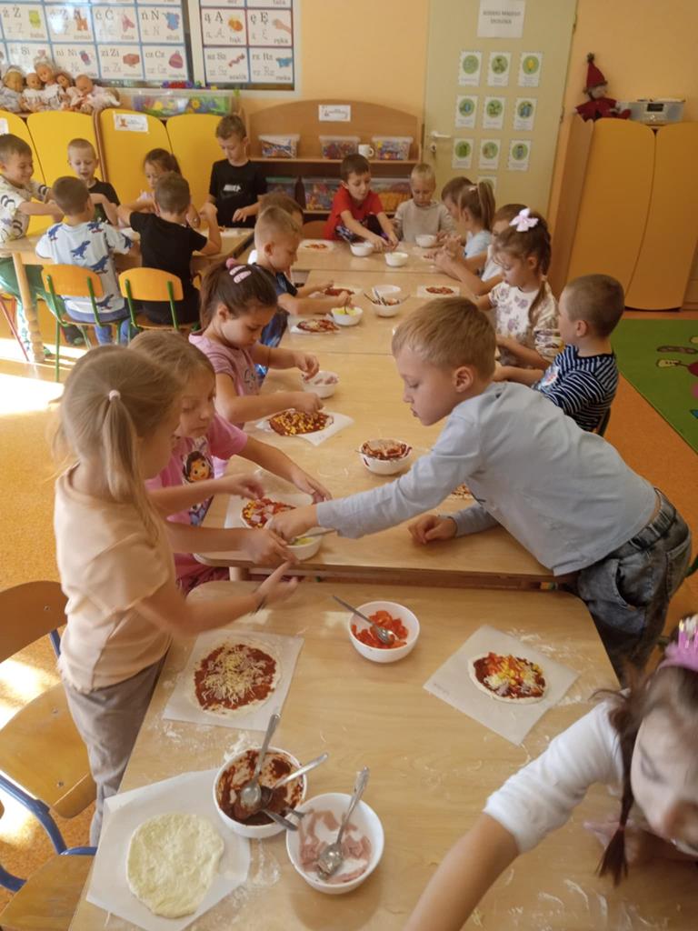 Dnia 29 października dzieci z grupy Pszczółek przygotowywały na zajęciach kulinarnych pizzę. Dzieci dowiedziały się jakie są niezbędne składniki do przygotowania ciasta. Samodzielnie wyrabiały ciasto i komponowały własne kompozycje smakowe a na koniec wspólnie zjadły swoje dzieła. Zajęcia z robienia pizzy w przedszkolu to doskonała okazja do nauki przez zabawę, która rozwijała zdolności manualne, społeczne a także promowała zdrowe nawyki żywieniowe.