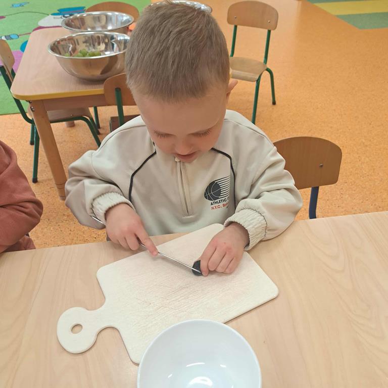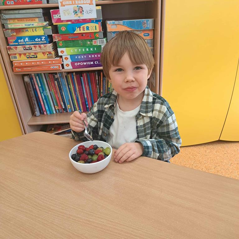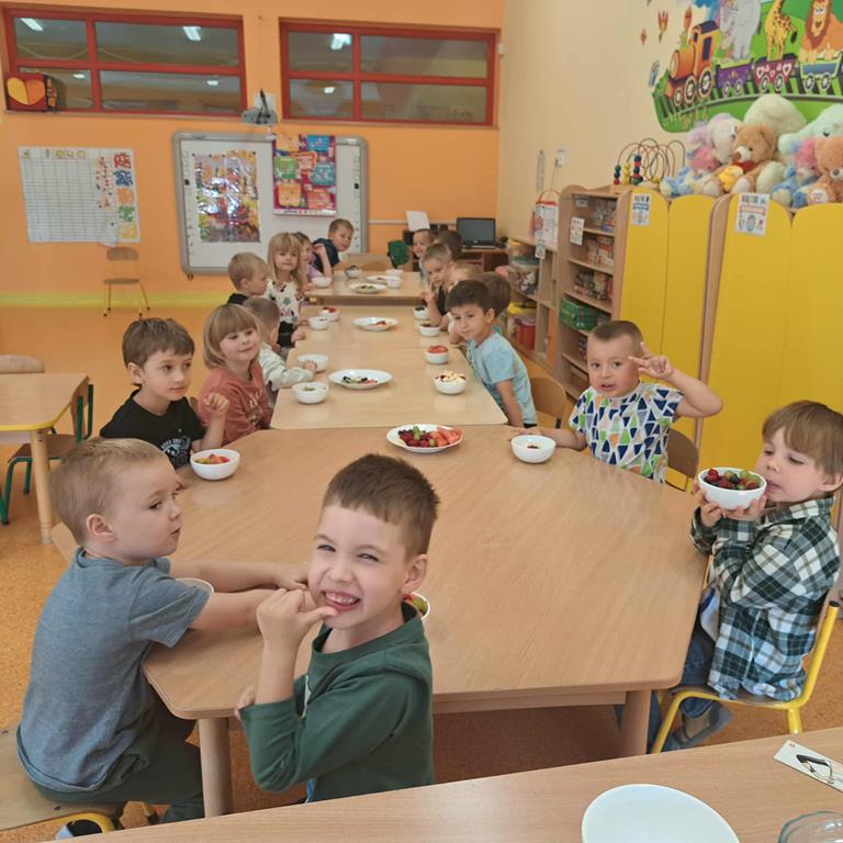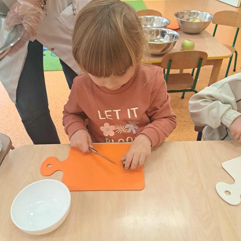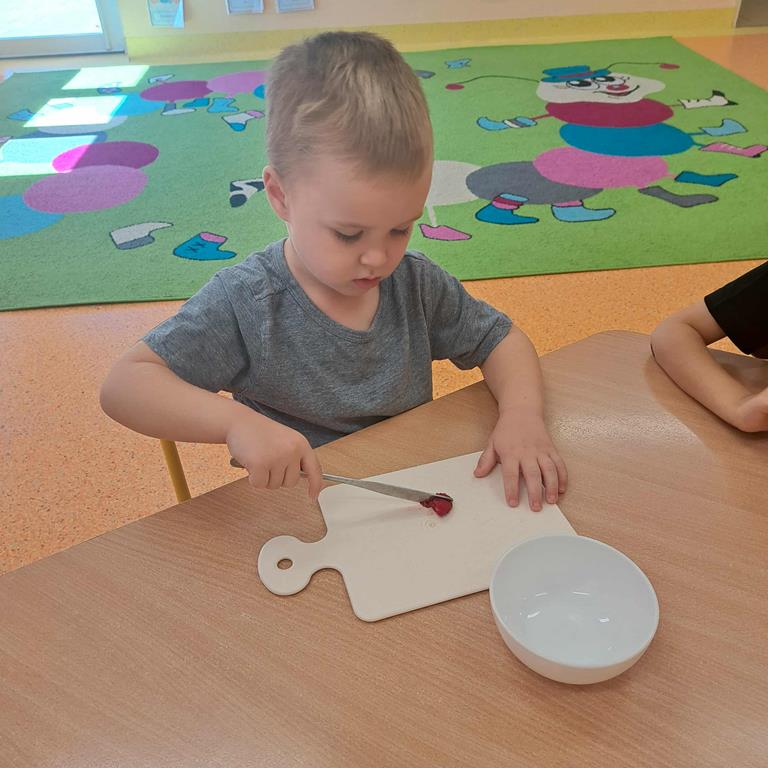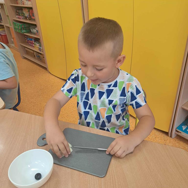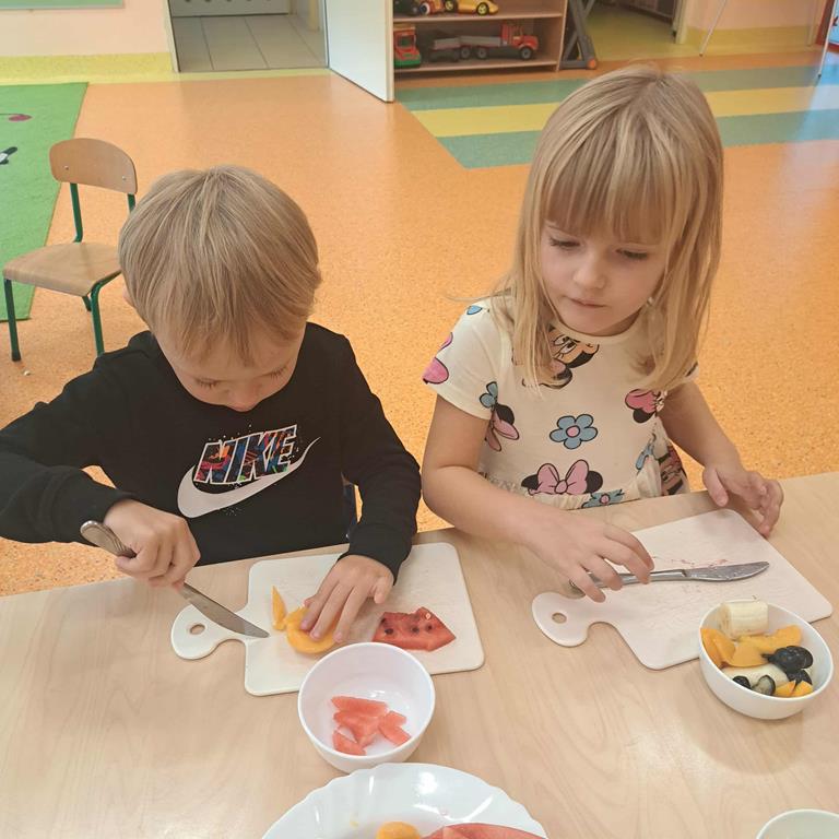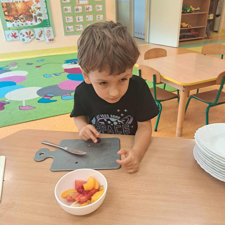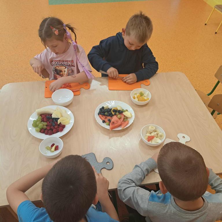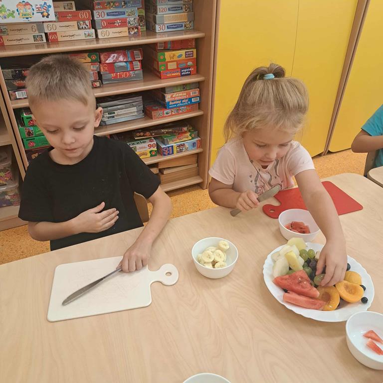 W dniu 26 września 2025 roku dzieci z grupy "Motylki" w ramach zabaw kulinarnych przygotowały pyszne i zdrowe sałatki owocowe. Każdy przedszkolak komponował własną sałatkę, wybierając ulubione owoce i doskonaląc umiejętność posługiwania się nożem. Dzieci poznały też właściwości owoców, brały udział w rozmowie na temat roli witamin w życiu człowieka.