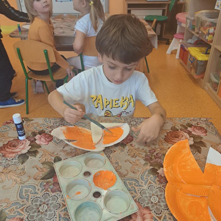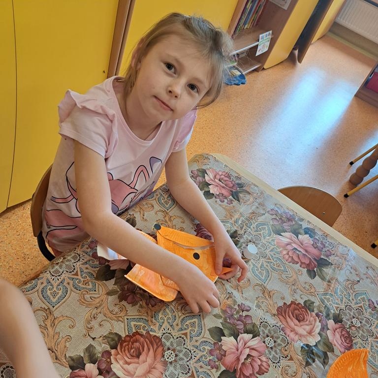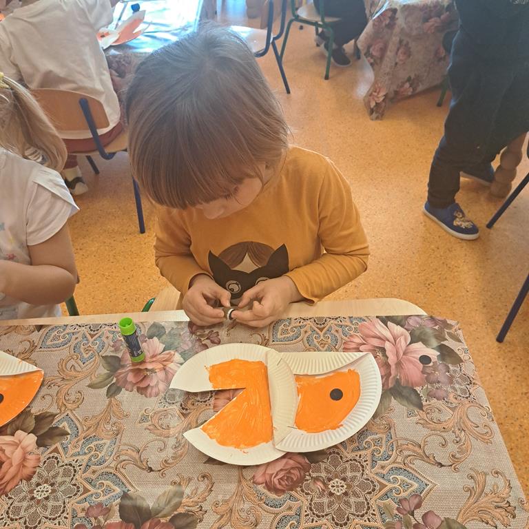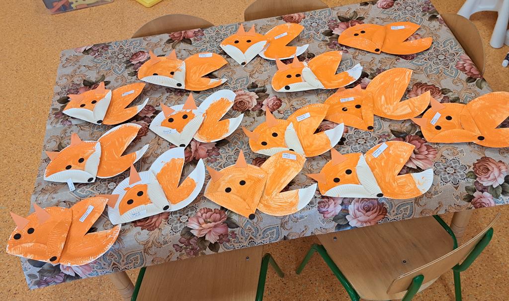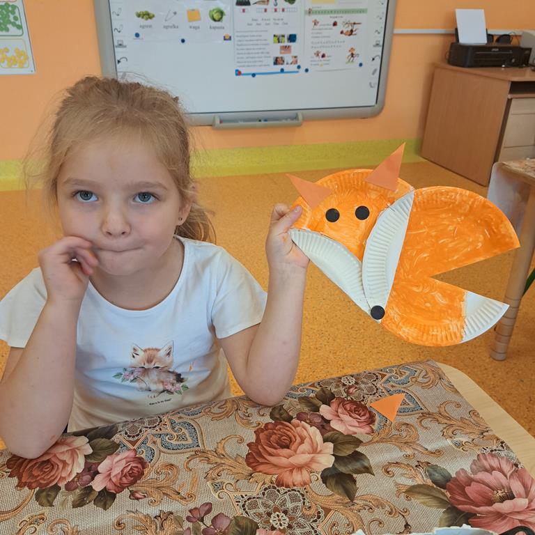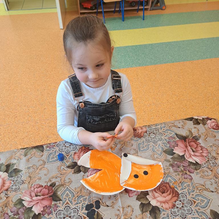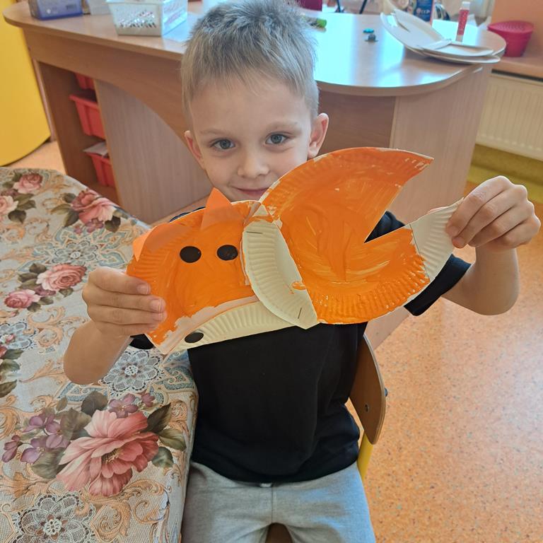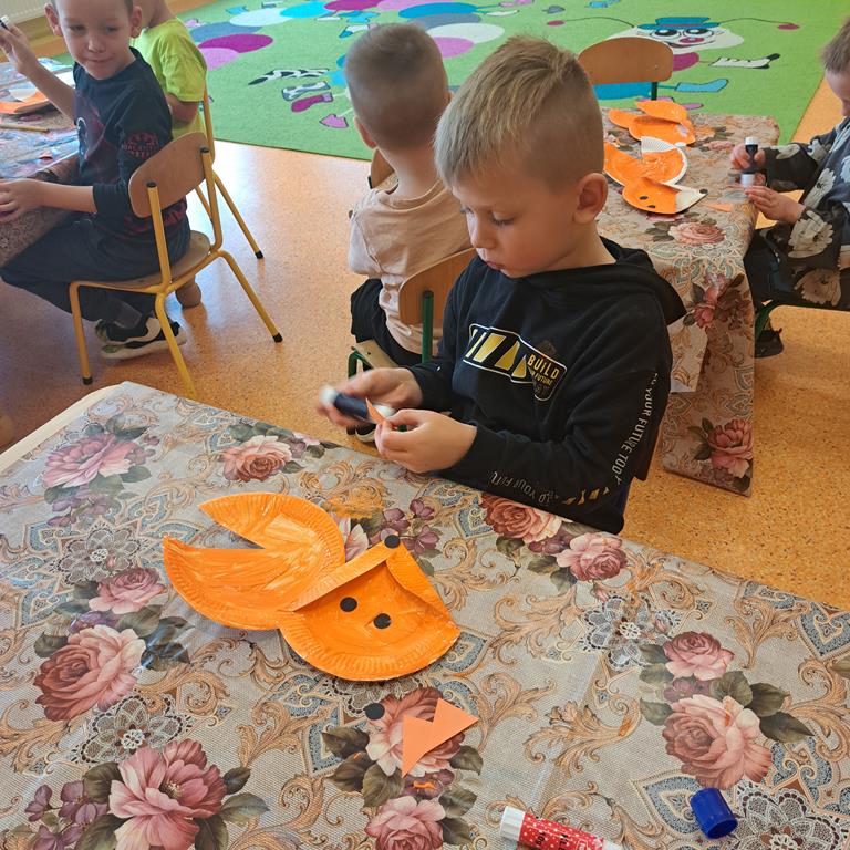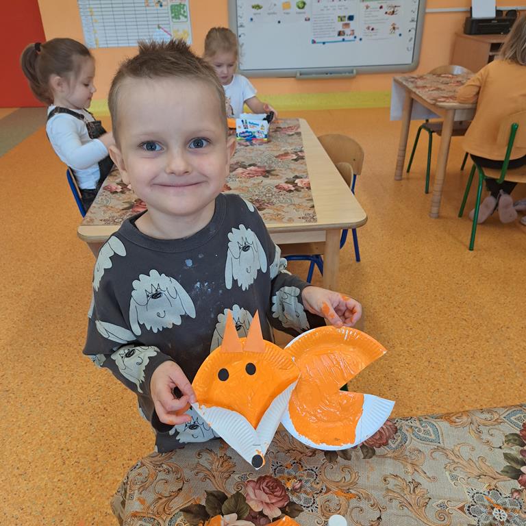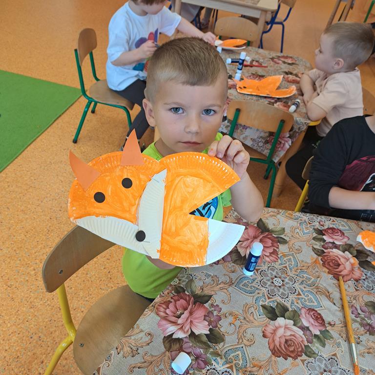 W dniu 17 października 2025 roku dzieci z grupy Motylki w ramach zajęć plastycznych wykonały pracę na temat "Lis" z wykorzystaniem papierowych talerzyków. Dzieci malowały talerzyki na kolor pomarańczowy, złączały oba talerzyki, tworząc sylwetkę lisa i naklejały elementy : oczy, nos, uszy.