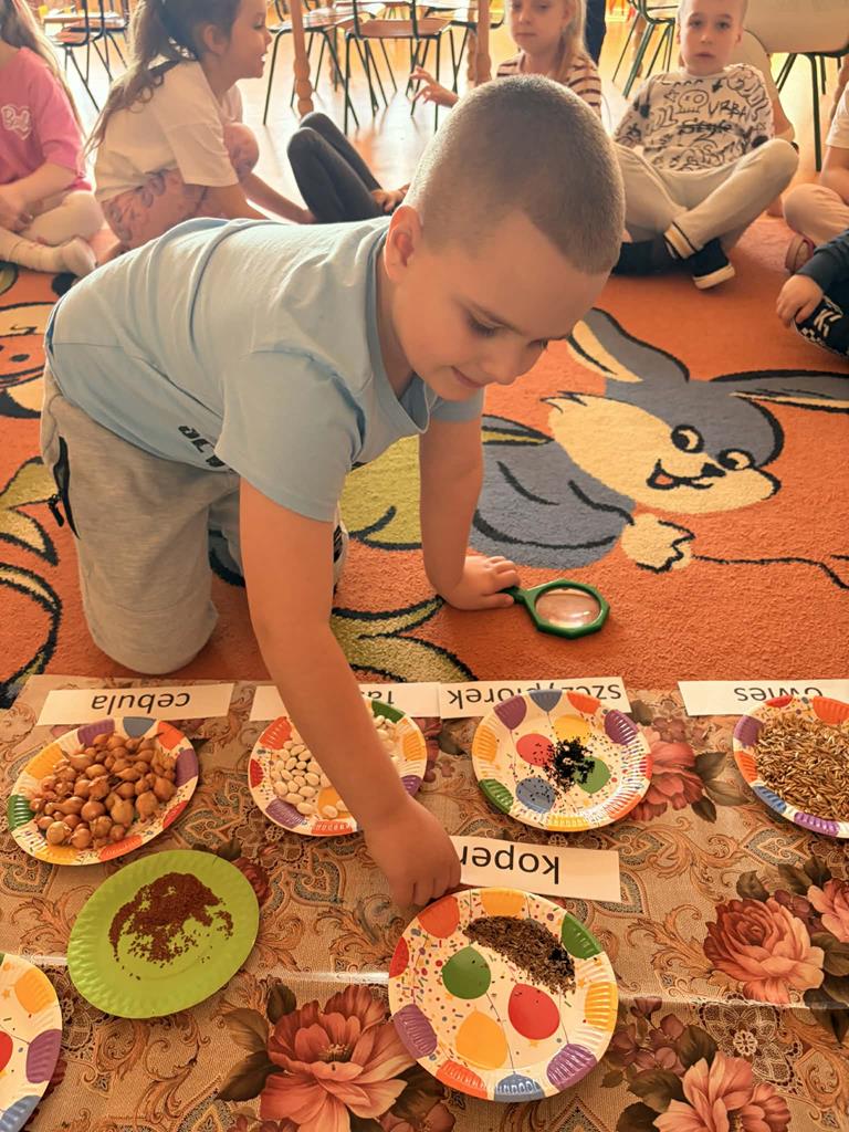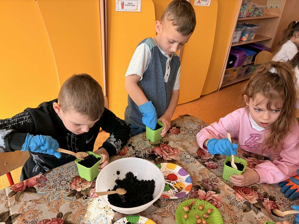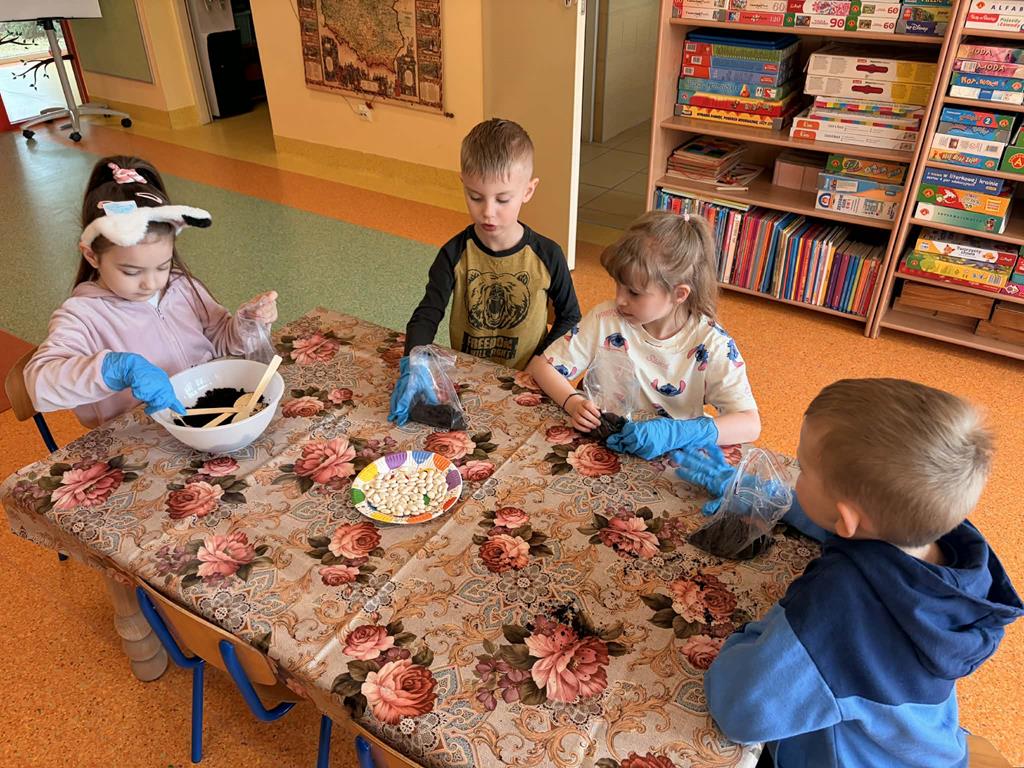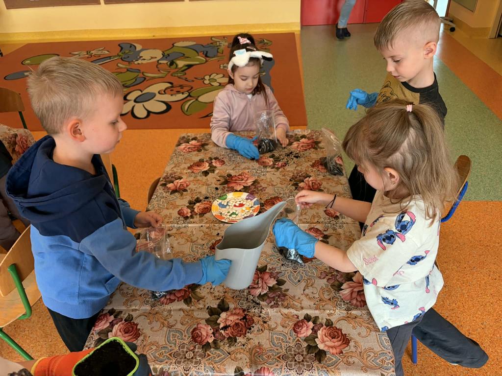 Dnia 24 marca Pszczółki na zajęciach poznały etapy wzrostu roślin. Na początku dzieci obejrzały film edukacyjny "Jak rosną rośliny?", po czym przedszkolaki samodzielnie układały historyjkę obrazkową „od ziarenka do rośliny” oraz wspólnie ustały czego rośliny potrzebują do życia. Następnie dzieci, wykorzystując lupy oraz zmysły dotyku i zapachu, rozpoznawały nasiona i cebulki, dopasowując do nich odpowiednie podpisy. Najwięcej radości sprawiło dzieciom działanie praktyczne – wspólne założenie ogródka w sali. Dzieci z dużym zaangażowaniem siały szczypiorek, bazylię oraz fasolę, a także sadziły cebulę. Teraz będą wspólnie dbać o swoje uprawy i prowadzić codzienne obserwacje ich wzrostu.